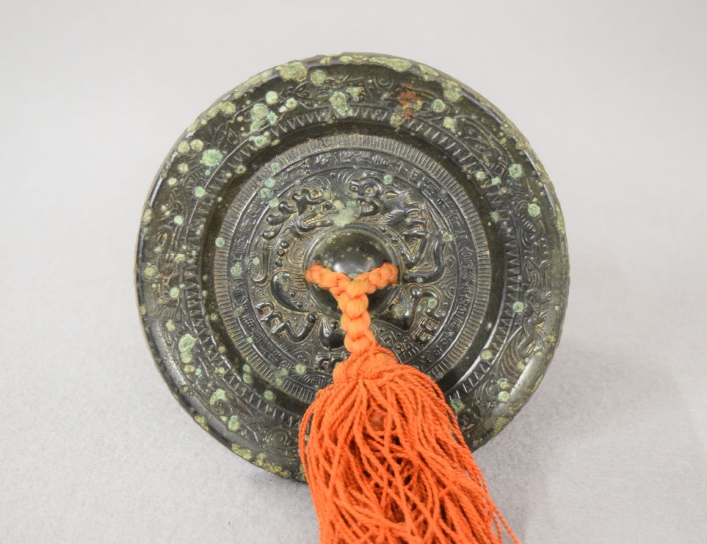 鏡子左側是有著瘤狀角的龍,右側則描繪了雙眼圓睜的虎。這類長角的龍可稱為「天祿」、「辟邪」,而虎有「禽獸」或「天獸」的別稱,人們相信它們能實現添子、招財、延壽等各種願望。據考,過去有多個工匠團體都會製作象徵蟠龍的「盤龍鏡」,當中以龍氏為代表,本件應該就是出自龍氏的精品。值得一提的是,在中國浙江紹興漓渚和浙江省上虞等地,都有出土和本件類似的鏡子,它們在設計表現、紋樣和銘文等方面有著相似之處。
