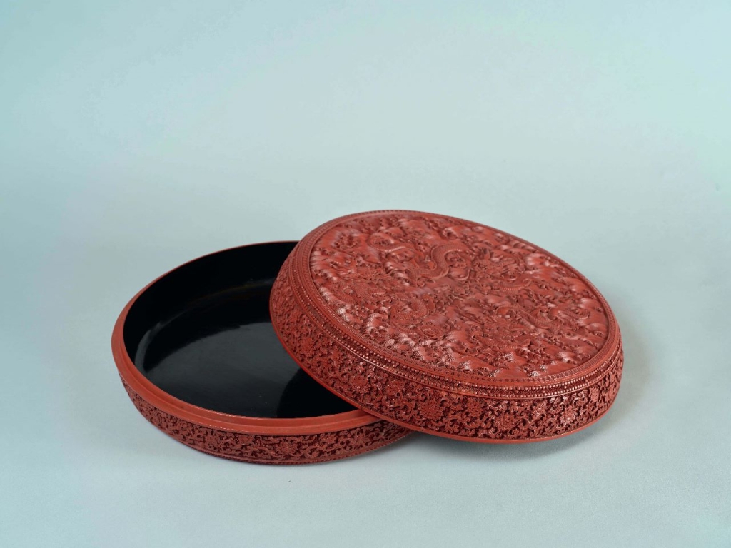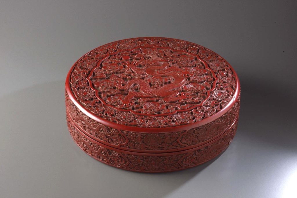 這是本展覽中首次公開展出的作品。圓形盒器身微鼓,整體使用了剔紅技法(日文稱「堆朱」),內部塗有黑漆,底部則是朱漆。蓋子上,三條五爪龍在波濤上相對,圍繞著中央的火焰寶珠。蓋子和器身側面飾以牡丹和唐草紋,地為相連的方格紋,邊緣則用細緻的連珠紋裝飾,雕刻之精巧,令人驚嘆。在北京故宮博物院有一件帶有乾隆銘文的漆盒,與本件相似,不過北京故宮的龍紋比例更大。