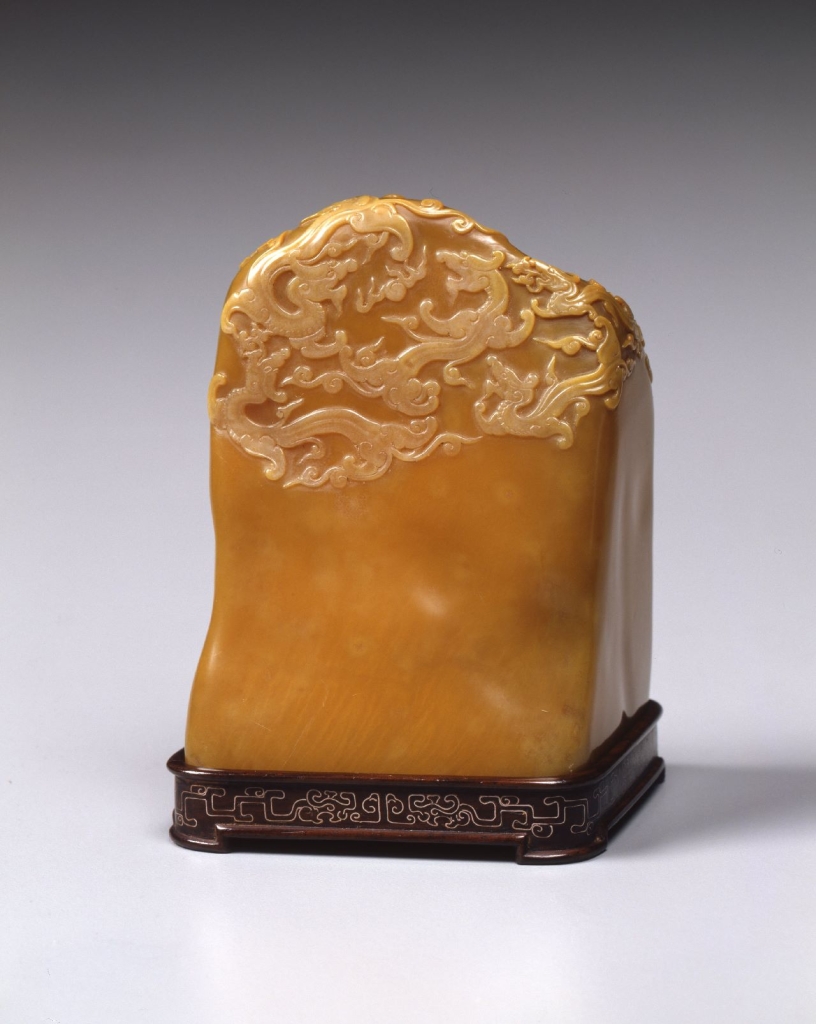 此印係中國福建省壽山地區的珍貴石材「田黃」,高度近10公分,體量罕見,印面未經雕刻。雕刻方面,使用了「薄意」技法(極淺的浮雕),利用石材的皮,一面呈現了包圍火焰寶珠的五龍,另一面則細緻地雕刻了旭日與雌雄鳳凰、牡丹等。
