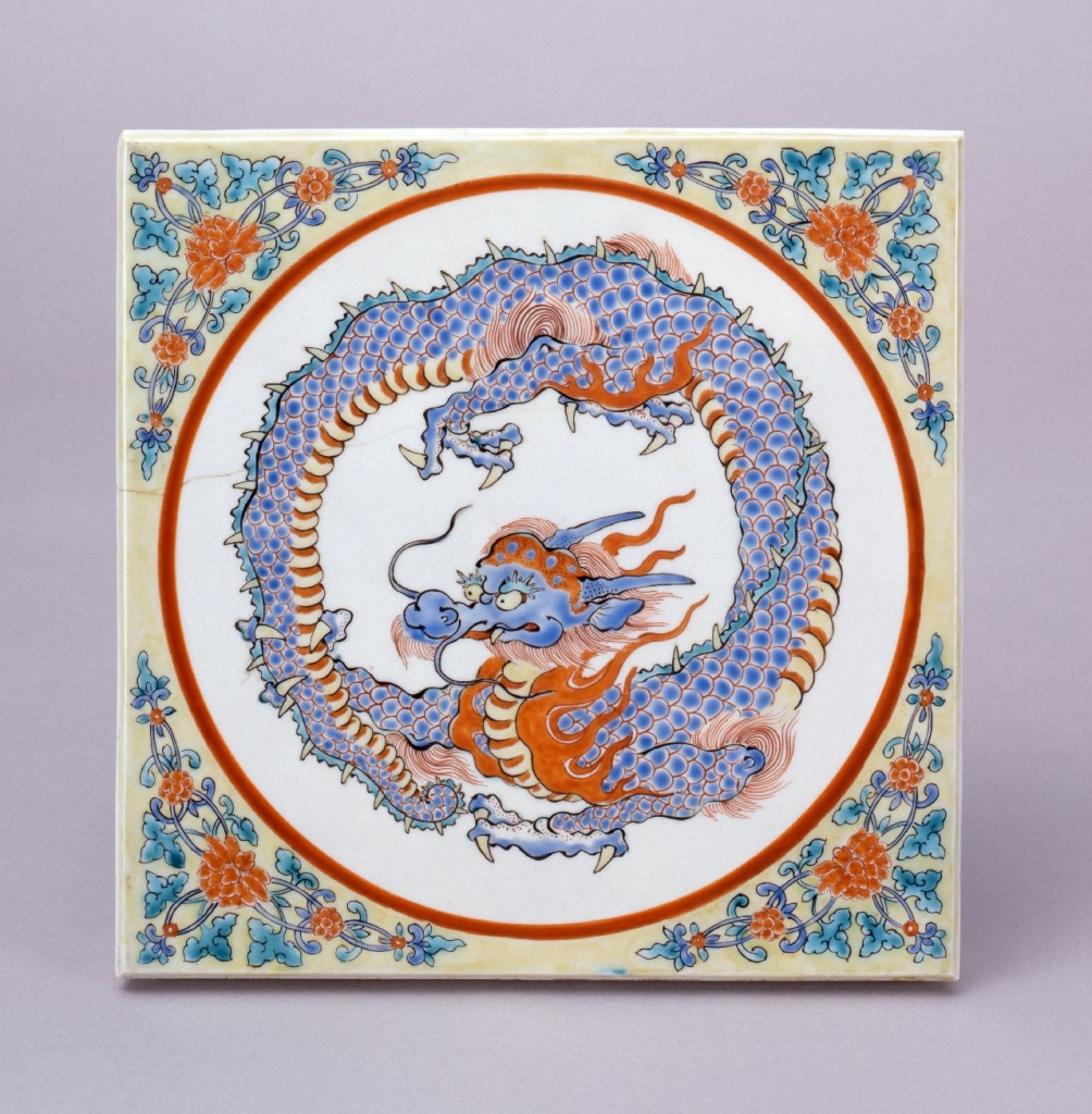這是一件日本有田燒(即伊萬里)厚釉陶板,在紅色的圓圈內,描繪青龍抓著自己尾巴,呈團龍姿態,在風格上被歸類為「柿右衛門(酒井田柿右衛門,江戶時代的陶工,1596-1666)」,陶板背面的附有四足。柿右衛門的特點是,在略施乳白色釉的胎上使用釉上彩,且大多例子中都僅有使用紅色描繪圖案。