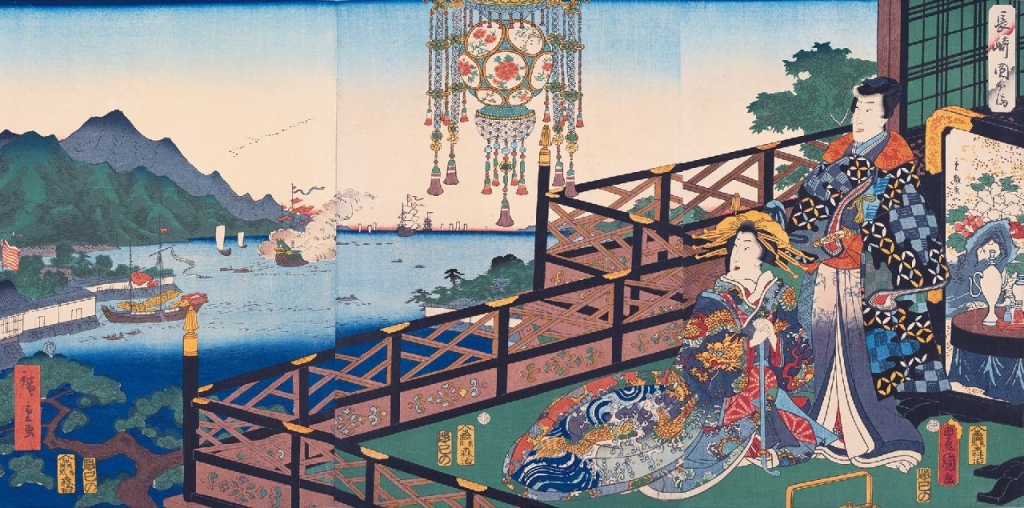 這幅浮世繪取景長崎唯一的花街──圓山,妓院內的男女遙望著海上的蒸氣船,畫中的玉燈籠(長﨑玻璃珠製成的吊燈籠)、茶壺、茶杯等,讓畫面充滿異國情調。一名花魁拿著長煙斗,頭上插滿了價值不菲的鼈甲簪,身穿龍紋「打掛」(婚禮時穿的華麗和服,花魁會穿這種衣服模仿結婚的氛圍)。男性穿著印有「源氏香」圖案的羽織,頭髮束成了海老茶筅髷(形狀似蝦和茶刷的髮髻)。