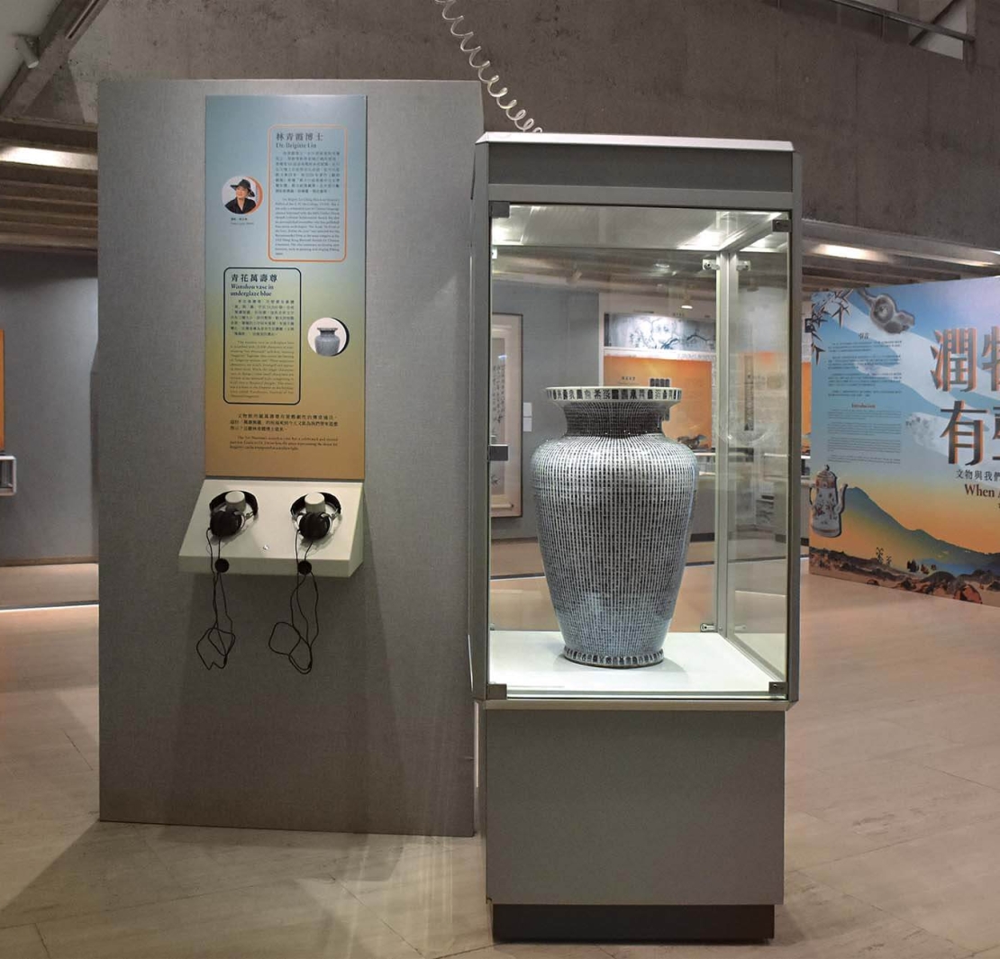 在60件展品當中,〈青花萬壽尊〉為文物館其中一件鎮館之寶。此尊是專為康熙皇帝生辰壽慶(又稱「萬壽節」)而進貢的禮品。〈青花萬壽尊〉的身形雄渾大氣,展示王者風範,外壁書有篆體「萬」與「壽」字共一萬個,合成「萬壽無疆」的祝願。這些吉祥文字共有三種大小,排列整齊,較大的形態各異,尊腹的小字則有重複,有過千種變化。然書寫嚴謹,一絲不苟,製作精良,世間罕有。