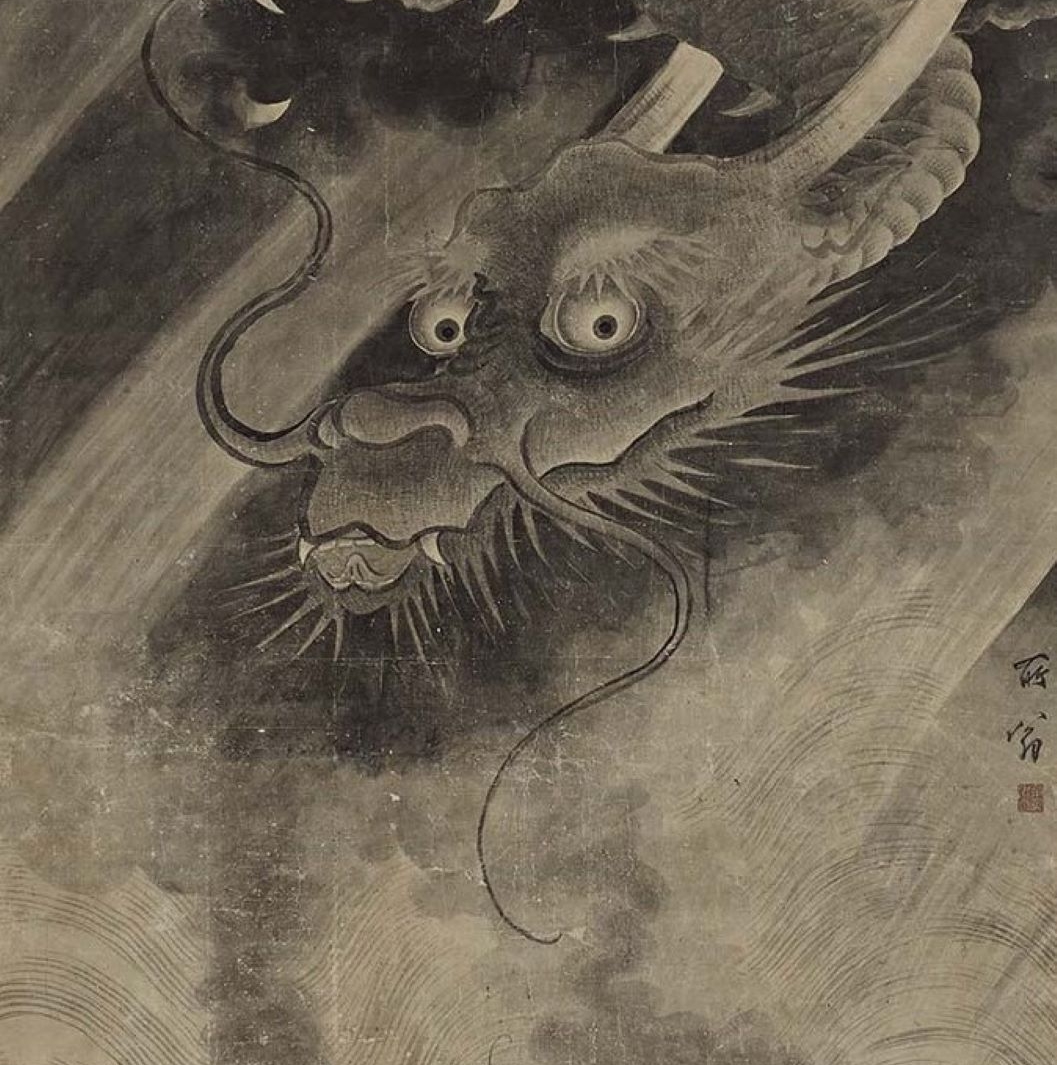 展出的傳宋人繪〈霖雨圖〉和傳陳容繪〈神龍沛雨圖〉(圖1)畫題均和神龍降雨有關,且構圖形式應源自同一母題傳統。〈霖雨圖〉中描繪一頭四爪金龍從雲間探出頭來,背景烏雲密布,有雨水隨時將落下的感覺,而雲中神龍正和海中的蛟龍對視,蛟龍表情成驚怖狀,或許和「蒼龍教子」的母題有關。另一件署名宋代陳容的〈神龍沛雨圖〉以墨色暈染出烏雲密布的天色,水面的驚濤駭浪則多以線條呈現,烏雲中一隻龍從雲中探出頭,睜大雙眼凝視著觀眾,畫面下半部則有一隻小龍看著雲中的龍。雲和水面間則用斜線加墨色烘染出下雨的氛圍。雖和陳容其他畫龍作品一樣善用墨色,但不似其他作品般神祕流暢,筆法上也多有不同,應為託名之作。