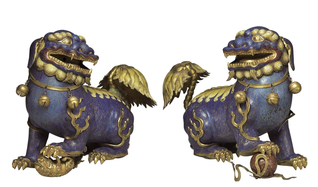 唐宋時的職貢圖繪畫中,可見從國外進貢的獅子,明代則開始有皇宮中養獅子,並請各國使者到皇宮欣賞獅子表演的紀錄。同時明人也開始把「狻猊」列入「龍生九子」之一而成為神獸。明人繪〈狻猊〉和清代劉九德繪〈狻猊〉畫中獅子眉毛上有斑點,耳朵的毛特別長,和我們熟悉的獅子不同。另外,清掐絲琺瑯〈獅子〉(圖6)一公一母,公獅腳下踩彩球,母獅則是小獅子在牠腳邊玩耍。和現今常見在重要建築門口的守護獅子類似,但立體獅子的樣貌慢慢和北京狗(又稱獅子狗)結合,和真實獅子越來越不一樣。這是古代藝術家或工匠沒有看過真的獅子,根據前人的畫作或說法再創作的成果。