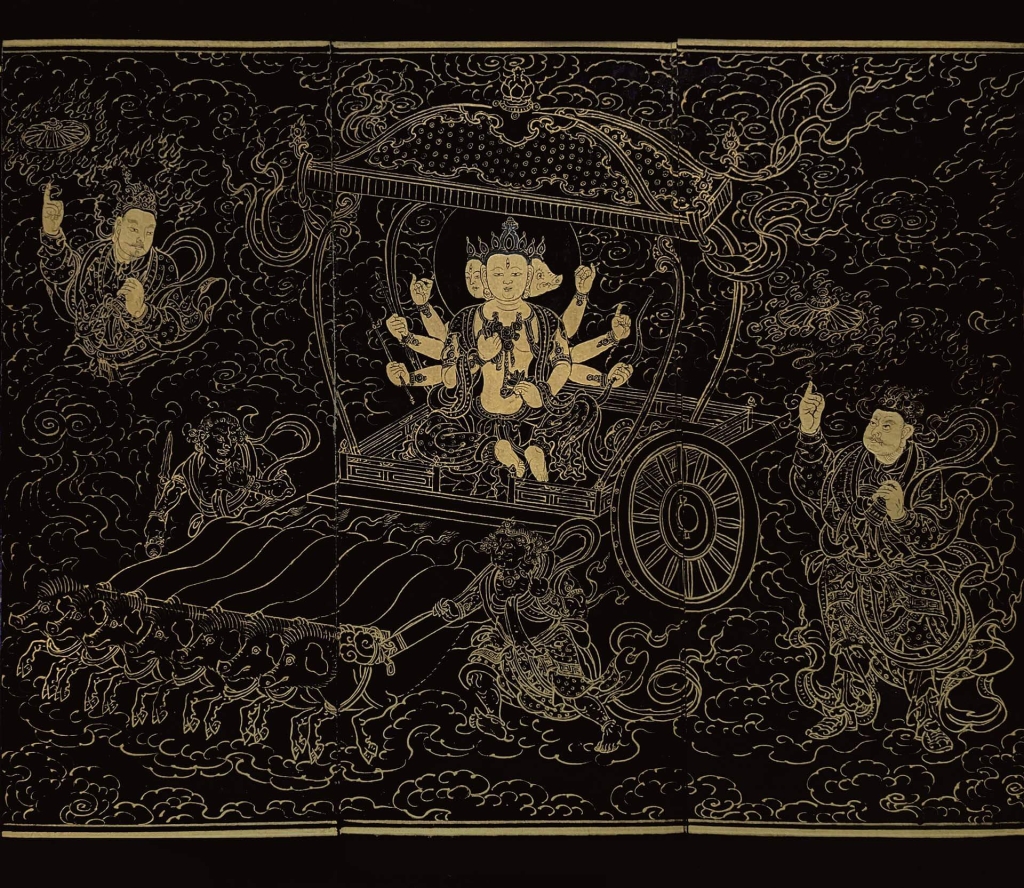 展覽的設計,確實能引導觀者,開啟多元的角度去觀看作品。也就是說,與佛教藝術相關的作品,除了以佛教義理回應之外,還有非常多的可能性。故宮南院前陣子熱鬧開展的「神獸現形─文物中的奇幻生物」特展便是一例。展覽中有多件屬於佛教藝術的作品,如文殊菩薩與獅、普賢菩薩與象。在這檔展覽中,觀眾並非被導向了解佛教義理,而是被引著玩味古人描繪「神獸」的想像力。除了獅與象,策展人還選出了一幅與豬的形象有關的作品,出自明代泥金寫本《摩利支天經》(圖5),因為頗為罕見而讓人驚喜。