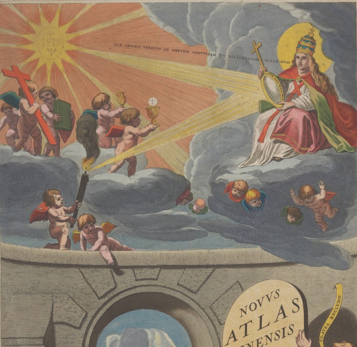 編者衛匡國(Martino Martini,1614-1661)是義大利出生的耶穌會修士,在明末清初的中國進行傳教活動,同時也發表了許多關於中國的著作。本書為中國地圖的彙整,扉頁的裝飾圖案則蘊含著多重意義,太陽的光芒像是耶穌會的紋章樣式,一個代表天主教會的擬人化女性,拿起鏡子反射太陽光,並照亮了天使手持的火炬,最後火炬照亮了畫面下方的亞洲地圖。天使們看似在計劃向亞洲傳教。