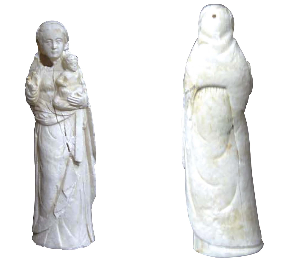 這類宗教圖像牙雕的尺寸,大部分與中國的觀音或神仙人物牙雕類似,大約在20至30公分左右,大部分德化白瓷之尺寸也在此範圍內,或較大者約30至40公分(圖6)。根據2013年出版的紀年1601年馬尼拉沉船遺跡報告,其中發現超過300件象牙雕,包括聖母抱子、聖嬰、和聖徒故事等主題(註4)。此沉船遺跡所見的牙雕更小,約手掌大小,推估為教堂或教友使用(圖7)。早期研究者Derek Gillman認為這類牙雕大部分為賞玩之用的裝飾小物,雖然它所包含的宗教人物主題相當多(註5)。