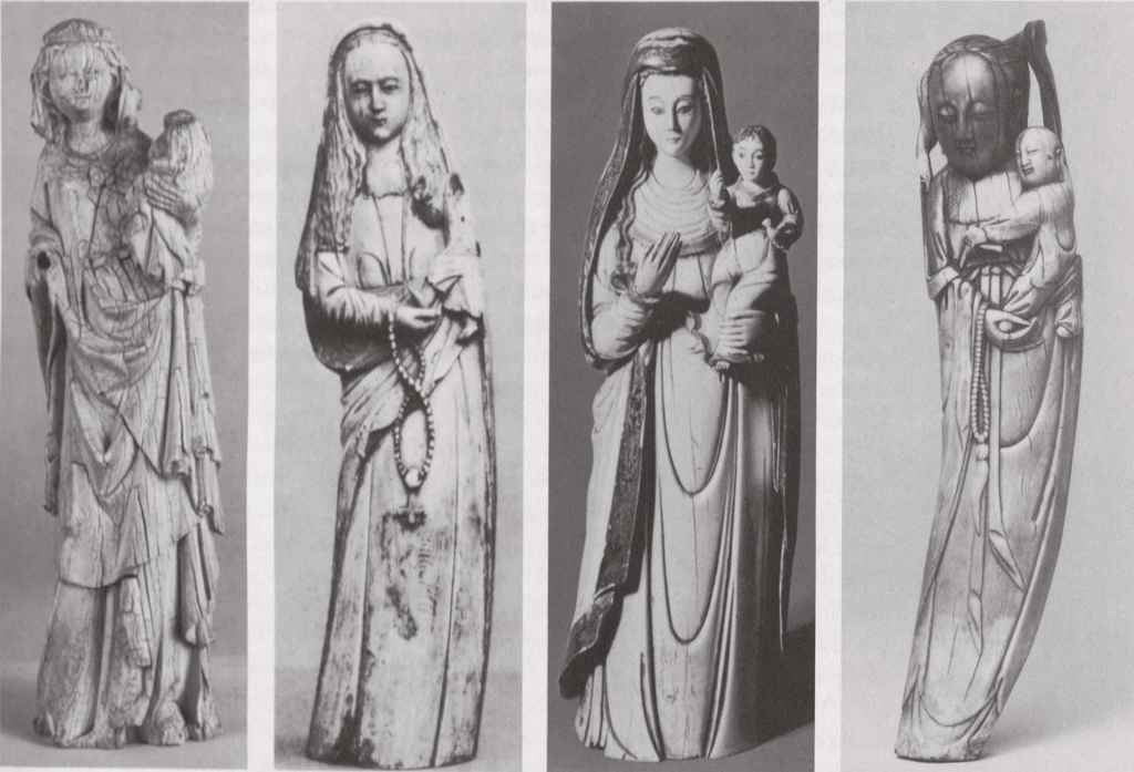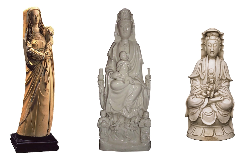 這批聖母象牙雕和白瓷,具同質性並且量多,印證聖母與地方神祇圖像或內涵互動所衍生之難題─它們的主題認同可能並非單一,透過文化流動的海洋場域,其使用更見複雜樣貌,既有傳教史的宗教脈絡,又加上世界史的商貿網絡。聖母主題的象牙雕,在這跨海域的地區,有以中葡(Sino-Portuguese)、中西(Sino-Spanish)、中菲(Sino-Filipino)、印葡(Indo-Portuguese)、或西菲(Hispano-Filipino)等風格標籤分類定名(圖8)。風格差異的第一因素常是面容,再者是服飾。面容的判讀似乎很武斷,然若仔細對比,確實也可以發現粗略的中國式和西方式之差異。有中國面容的女性抱子像,易於在博物館中被登錄為觀音,然與其他類似物件相比,它亦可能為聖母或聖母/觀音雙角色並行。若人物面容之差異化可代表某種產地需求或族群認同,則聖母信仰作為一個世界性連結的宗教現象,其世界史脈絡可藉由這批史料具體呈現。