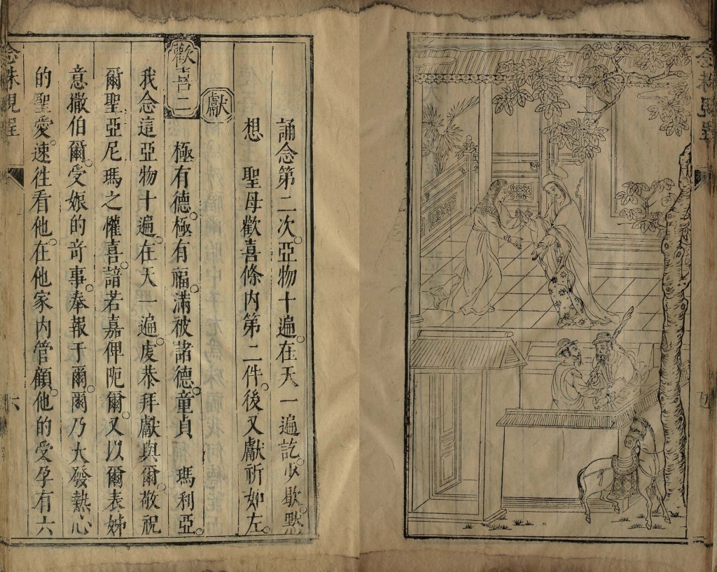 17世紀中國流傳的第一本配有圖像的聖母祈禱用書,名為《誦念珠規程》(約成於1600至1616,以下簡稱《念珠》,圖9),是最早採用《福音圖史》圖像,再刻印的中國木版作品。其中包括15幅耶穌及聖母生平事蹟版畫,除最後一幅,14幅全揀選自《福音圖史》的圖像。這本聖母祈禱小冊,值得在本文最後略作介紹,因其與羅馬聖母像可能的禮儀使用脈絡有關,若一起考慮《程氏墨苑》聖母像之母本,兩者皆指向日本傳教區。現刻在日本東洋文庫博物館,有關於天主教交流史和傳教士文獻的特展,當中16世紀日本耶穌會傳教區的史料,亦呼應這個歷史脈絡。