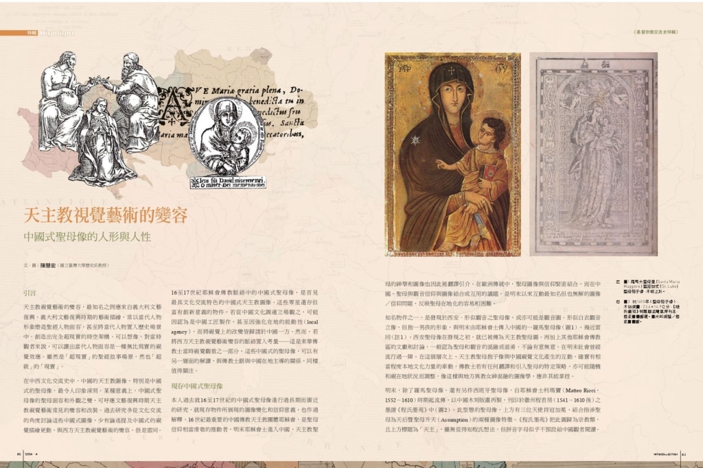 在中西文化交流史中,中國的天主教圖像,特別是中國式的聖母像,最令人印象深刻。某種意義上,中國式聖母像的聖母面容和外觀之變,可呼應文藝復興時期天主教視覺藝術常見的變容和改裝。過去研究多從文化交流的角度討論這些中國式圖像,少有論述提及中國式的視覺描繪更動,與西方天主教視覺藝術的變容,很是雷同。