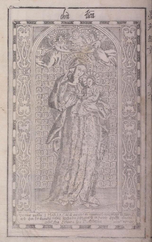 明末,除了羅馬聖母像,還有另件西班牙聖母像,自耶穌會士利瑪竇(Matteo Ricci,1552-1610)時期起流傳,以中國木刻版畫再製,刊印於徽州程君房(1541-1610後)之墨譜《程氏墨苑》中(圖2)。此型態的聖母像,上方有三位天使持冠加冕,結合指涉聖母為天后暨聖母升天(Assumption)的兩種圖像特徵。《程氏墨苑》把此圖歸為宗教類,且上方標題為「天主」,雖無從得知程氏想法,但拼音字母似乎不預設給中國觀者閱讀。