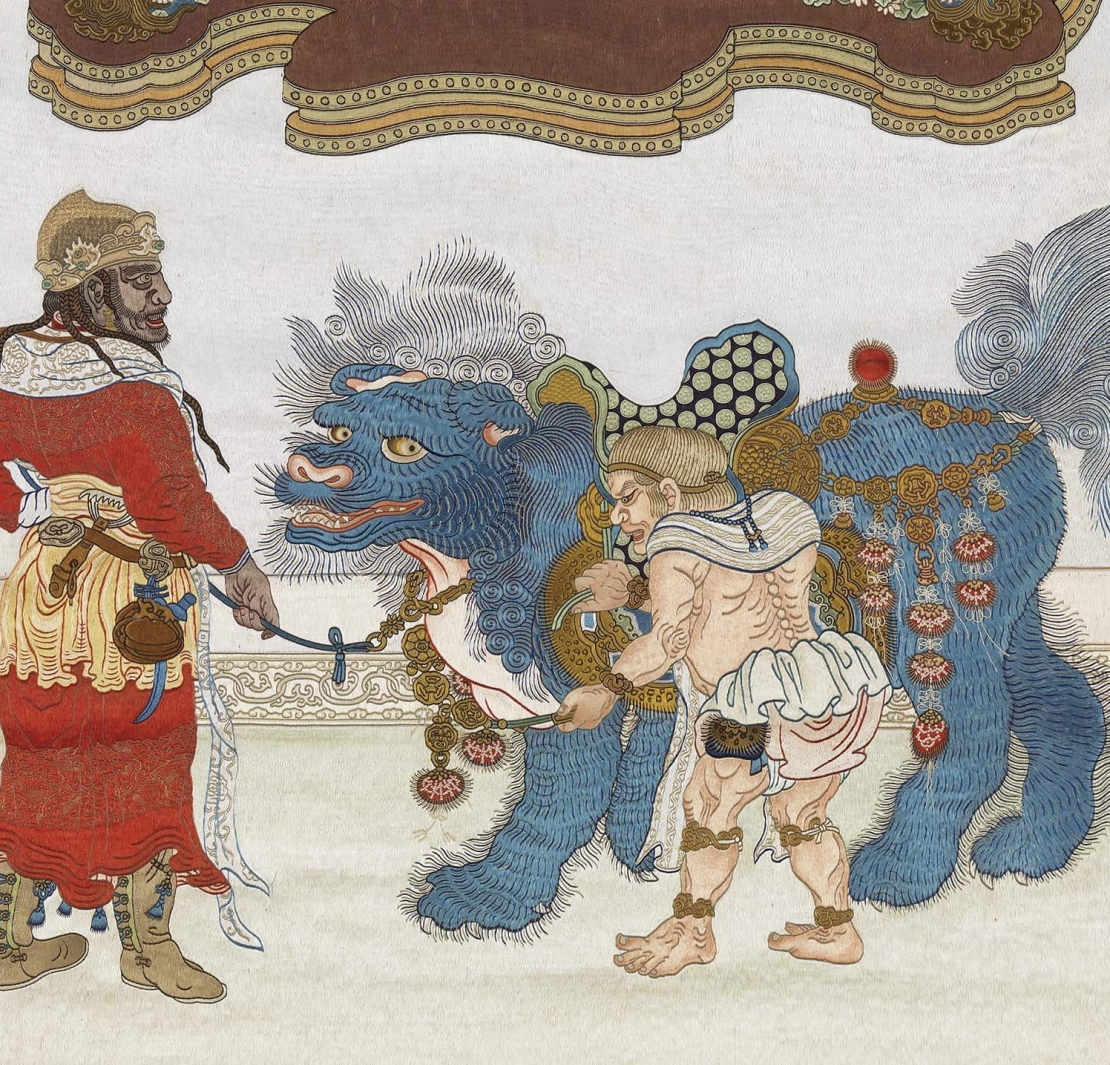 您注意過文物中的奇幻生物嗎?繪畫中的狻猊、佛像上的巨蛇、瓷盤上的鯉躍龍門、經版插圖的金翅鳥……珍異神獸幾乎無所不在,展覽以四個提問設計單元,從神獸樣貌、地位、特殊能力到出沒處,全面解析文物裡的奇幻生物。展件〈文殊菩薩〉、〈普賢菩薩〉同出《繡線佛像》,細膩呈現被馴服成為神祗坐騎的神獸形象,文殊菩薩騎乘青獅,象徵以獅吼威風震懾魔怨;普賢菩薩駕白象,代表堅韌無畏的願行。除了神佛坐騎,文物中的神獸亦有真實動物、幻想的組合生物或擬人化形象,展覽共百餘件作品,分前後兩檔展出,並以親子概念策劃,搭配插畫、淺白說明文字及低展櫃,適合闔家共賞。
