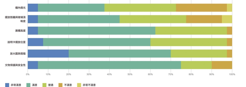 此次填表者包含服務5年至30年以上的資深志工(圖1)。在「展件陳設」單元,我們針對與展櫃的相關問題設計滿意度調查(圖2),整體勾選普通至滿意評價的人數高於70%,僅「櫃內燈光」與文物「擺放距離與玻璃清晰度」類項少數人認為可加以改進。有關此議題,過去故宮北院曾藉由提高櫃內基礎照明色溫,與添購展櫃低反射玻璃等方案進行改善,由於燈光亮度與玻璃的選擇實與文物保護技術緊密相關,期待未來的研究與新技術的開發能使展櫃有更完美的呈現(註2)。