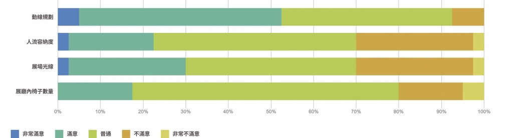 「展場空間」單元,勾選普通至滿意以上的人數高於70%(圖3),其中30%填答者認為「人流容納度」與「展場光線」值得調整。隨著疫情的結束,近年參訪旅客的大幅增加,展廳內的人流控管將成為新的改善議題。除了考慮擴增展場空間,故宮2014年在年度觀眾意見調查報告上,曾提出針對人流控管問題的解決方案,包含開放夜間參觀、鼓勵16:30至18:30離峰時段票價優惠等方案(疫情前週一至週四及週日閉館時間為18:30,週五及週六為21:00。疫情至今週二至週五閉館時間調整為17:00,週六、日為18:00)或許也可研擬參考。