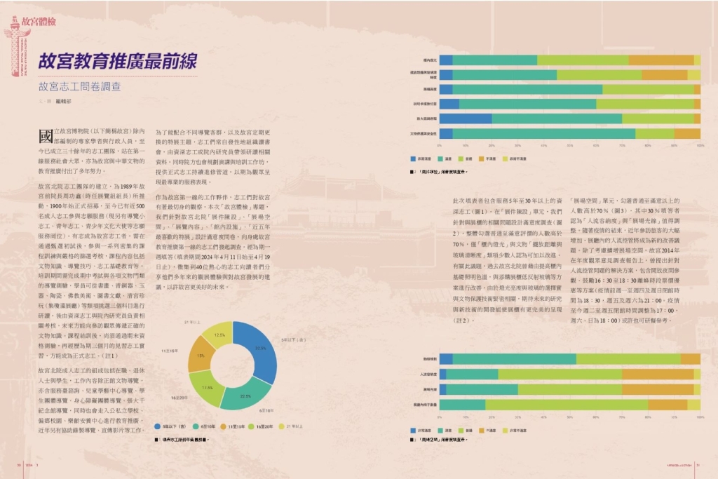 作為故宮第一線的工作夥伴,志工們對故宮有著最切身的觀察。本次「故宮體檢」專題,我們針對故宮北院「展件陳設」、「展場空間」、「展覽內容」、「館內設施」、「近五年最喜歡的特展」設計滿意度問卷,向身處故宮教育推廣第一線的志工們發起調查。經為期一週填答(填表期間2024年4月11日始至4月19日止),徵集到40位熱心的志工向讀者們分享他們多年來的觀展體驗與對故宮發展的建議,以許故宮更美好的未來。