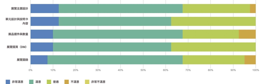 在「展覽內容」(圖4)的評比,勾選普通至滿意以上的人數高於90%,足見在第一線向觀眾導覽的志工,不論在展覽主題、說明卡、選件、DM、圖錄上都給予近年故宮策展團隊高度評價。