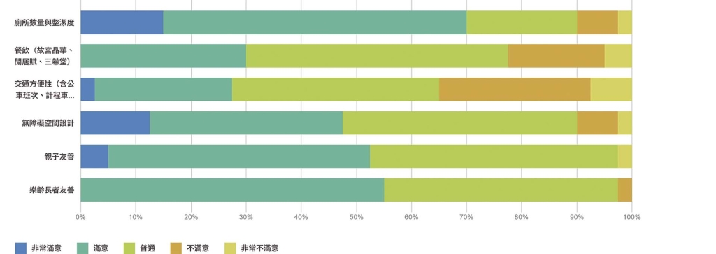 另在「館內設施」方面(圖5),除對故宮「交通方便性」有約35%作答人認為仍有改善空間,其他議題勾選普通至滿意以上人數高於75%。故宮現有連外交通工具以公車與計程車為主,近年臺北市政府都市發展局推動的捷運環狀線北環段上,新設計了可由士林站轉乘至Y28故宮博物院站的交通動線,故宮現也正與臺北市都發局研擬可直達圖書文獻大樓前廣場的出入口,期待未來故宮的交通方便性能有更便捷與多元的選項(註3)。