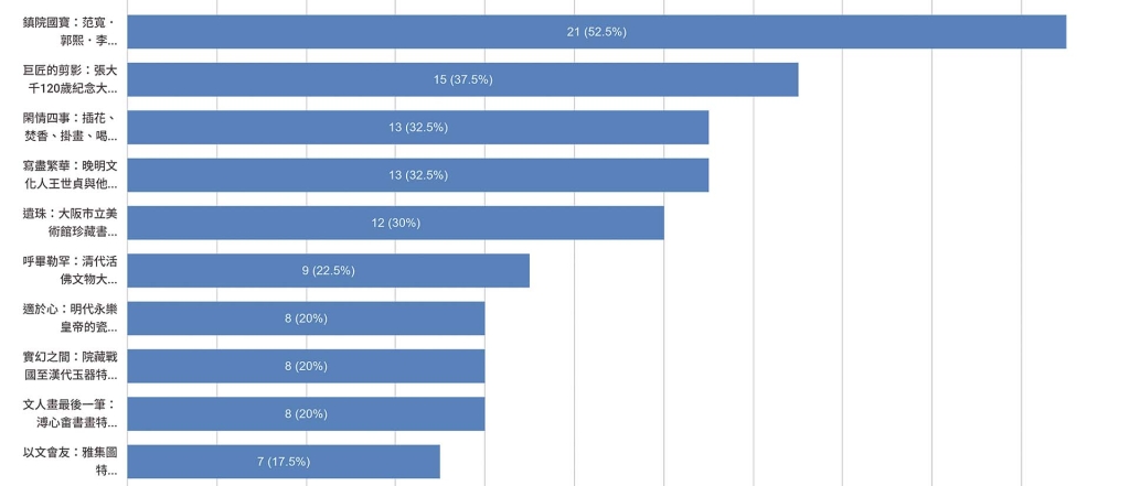 在展覽主題部分,本次我們調查了「近五年最喜歡的特展」,並統計出前十大最受志工們喜愛的北院特展(圖6)。其中2021年10月6日至11月16日舉辦的「鎮院國寶─范寬.郭熙.李唐」(圖7)奪得桂冠。該展一次展出北宋范寬〈谿山行旅〉、郭熙〈早春圖〉、李唐〈萬壑松風〉三件畫史名蹟。三件作品均為展陳不能超過42天的限展品,且規定每次展出後需休息三年以上方能再次展覽,距上次合體展出已有十年,故深受服務多年的志工們喜愛。