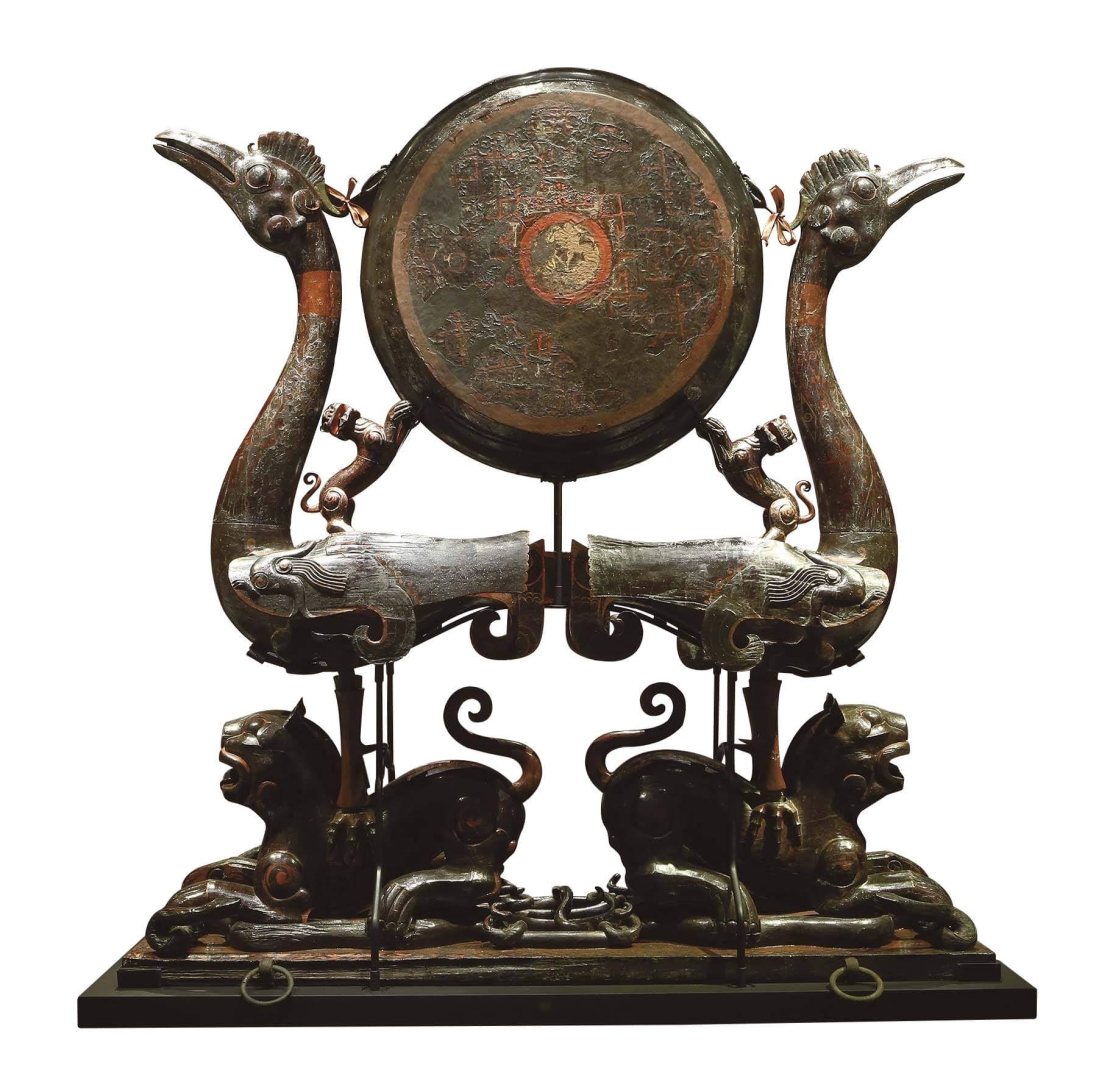 過去由於史家的偏見和史料的缺乏,與秦爭霸失敗的楚國未能得到應有的重視。因為史書中沒有正式記載,曾國的存在直到最近才被考古證實。1978年,隨州擂鼓墩曾侯乙墓的發掘,堪比古埃及圖坦卡蒙國王墓的發現,其隨葬品之豐富和品質之精美令世人驚嘆。最重要的發現是一套由65件不同尺寸編鐘所組成,迄今為止發現最大最全的一套編鐘(圖1)。此套編鐘音域廣、音律全,能夠演奏各種樂曲,代表當時世界上最複雜的青銅製作。其它隨葬品也都設計巧妙,工藝精湛,如〈銅圓尊盤〉和〈銅方鑑缶〉(圖2)等,堪稱青銅時代最精美的藝術,顯示曾國積累的巨大財富和發達的文化技術。