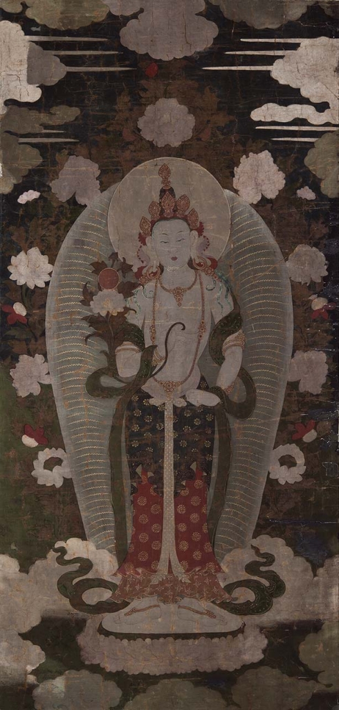 例如〈日光菩薩(Suryabaskara)立像〉(圖1)表現的即是典型的菩薩圖像。菩薩是指那些發心成佛的眾生,他們選擇推遲自己的覺悟,以救濟眾生,直到所有生命從無盡的輪迴苦海──生、死、投胎中解脫。清朝皇帝崇奉藏傳佛教並資助寺院的建設與裝飾,當時還邀請了喇嘛,並贊助了佛教經典的印刷,這幅畫作便是此期間在內蒙古或中國所作。就其風格特徵而言,這幅畫可以與韓文化基金會(Hahn Cultural Foundation)收藏的蒙古沉香木佛像畫比較(註1),尤其在圓光的描繪、較暗的風格化景觀背景以及描繪菩薩環繞中央人物的視覺傳統。