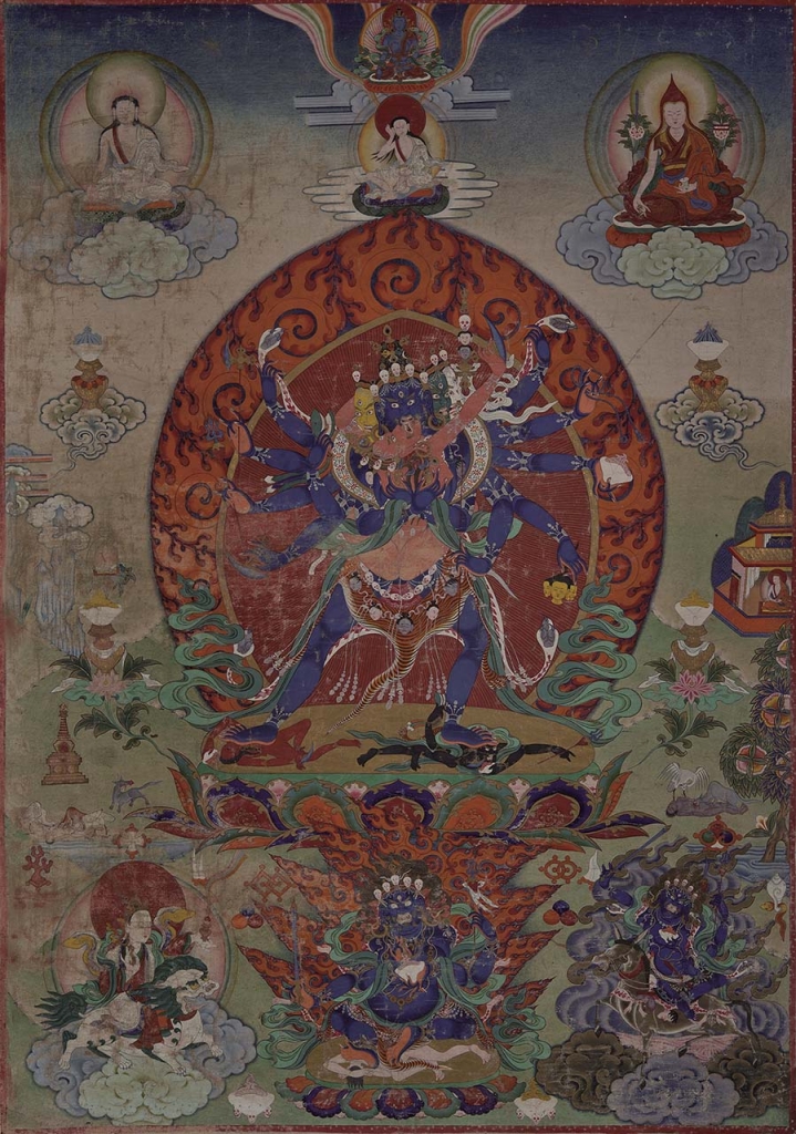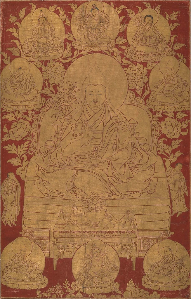 在藏傳佛教傳統中,宗教導師和密宗大師與佛陀同等重要。他們被視為佛教教義和口述道理的來源,據說是密宗實踐中取得進展的關鍵。這些導師的形象結合了佛陀的圖像元素,包括手印(mudra)和儀式用具。有時他們以具個人特徵的理想肖像呈現,還會描繪出傳承或化身世系(incarnation linages)。就像第五世達賴喇嘛阿旺洛桑嘉措(Ngawang Lobzang Gyatso,1617-1682)的畫作(圖6),以紅色為底,上施金色顏料,並以紅色精細勾勒出輪廓。達賴喇嘛被描繪為位處中央的主導人物,周圍環繞他的前世化身,並透過這些前世將他的宗教和世俗權威追溯到印度佛教和古代西藏的根源。