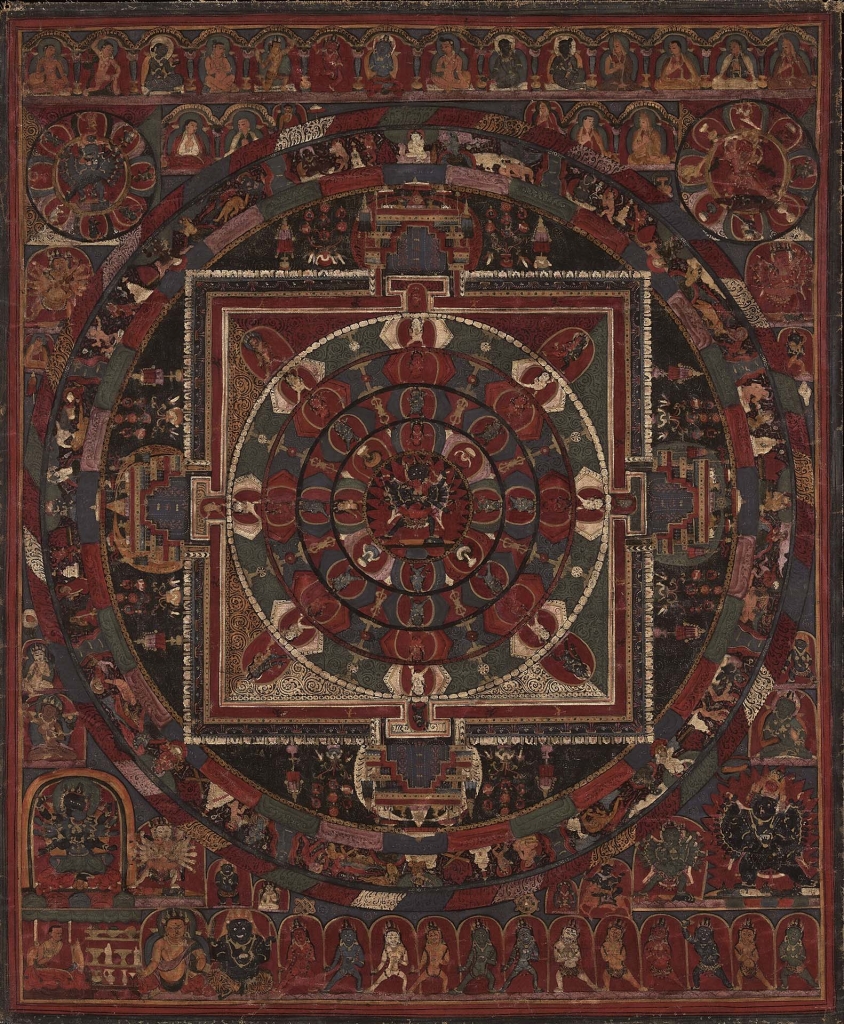 對於密宗修行者來說,壇城(mandalas,或稱曼荼羅或曼陀羅)圖像可作為視覺輔助,在灌頂儀式(empowerment ceremonies)啟動特殊的修法,也是他們日常觀想修行的指導圖譜(圖10)。壇城通常由內為方形,外為圓形的結構所組成,代表特定神祇居住的神聖領域。在此例中,中央神祇是勝樂金剛和金剛亥母的合一形象,周圍環繞著隨眾,位居壇城宮殿的至高點,而該宮殿是個由四名守門人守護四邊主要入口的3D結構。畫中系譜包括上方的印度與西藏上師以及圍繞壇城外部的神祇,代表了密宗神祇和藏傳佛教薩迦派傳統的守護者,而畫面左下角的僧侶供養人形象也值得注意。
