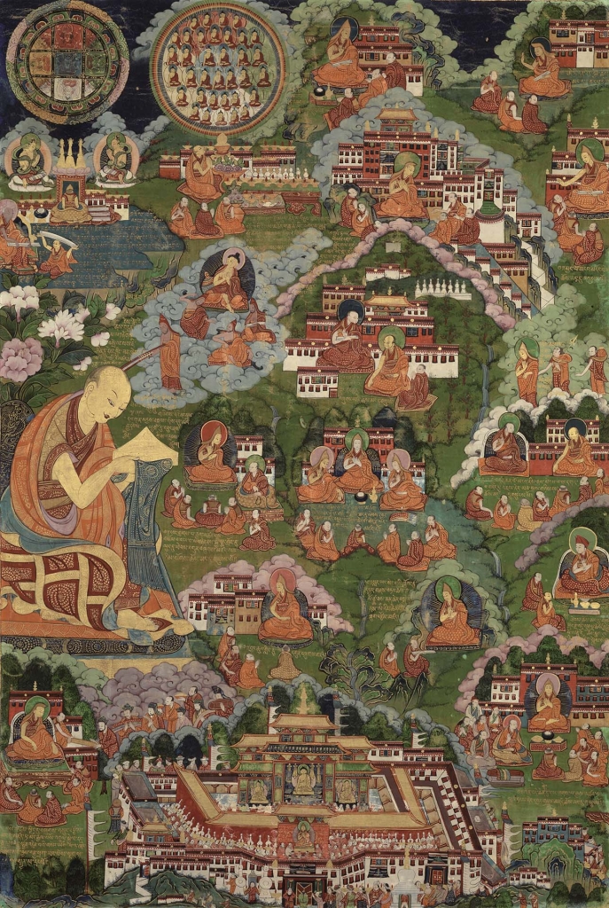 重述著名大師的生平在藏傳佛教傳統中是一項重要的文化實踐,以作為僧侶、尼姑和在家居士的靈感啟示。許多由著名佛教大師的弟子親撰的傳記,如:宗喀巴(1357-1419)的生平故事,描述了他的宗教和學術事蹟。他是藏傳佛教四大派別中最年輕的格魯派傳統的創始宗師。一系列描繪他生平的畫作被翻刻為木刻作品,這有助於傳播他的傳記,並在藏族地區中流傳以建立格魯派宗教傳統。展出的〈宗喀巴的生平事蹟〉即是敘述他生平事蹟的系列畫之一(圖11)。被描繪為巨型人物的宗喀巴位居畫面左側,偏離中心。許多刻有文字說明的場景散佈在被雲、樹、山、谷分隔的背景之中。這幅畫將宗喀巴傳記視覺化呈現,透過畫中的建築往往可以識別出事件與地點,當中有不少與他生平緊密相關的重要據點。
