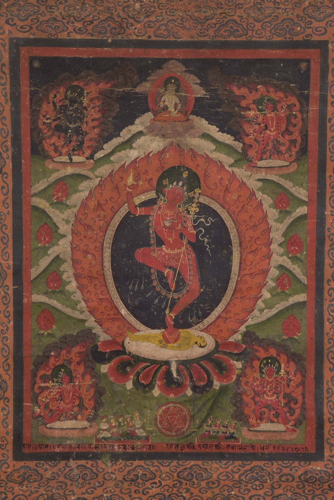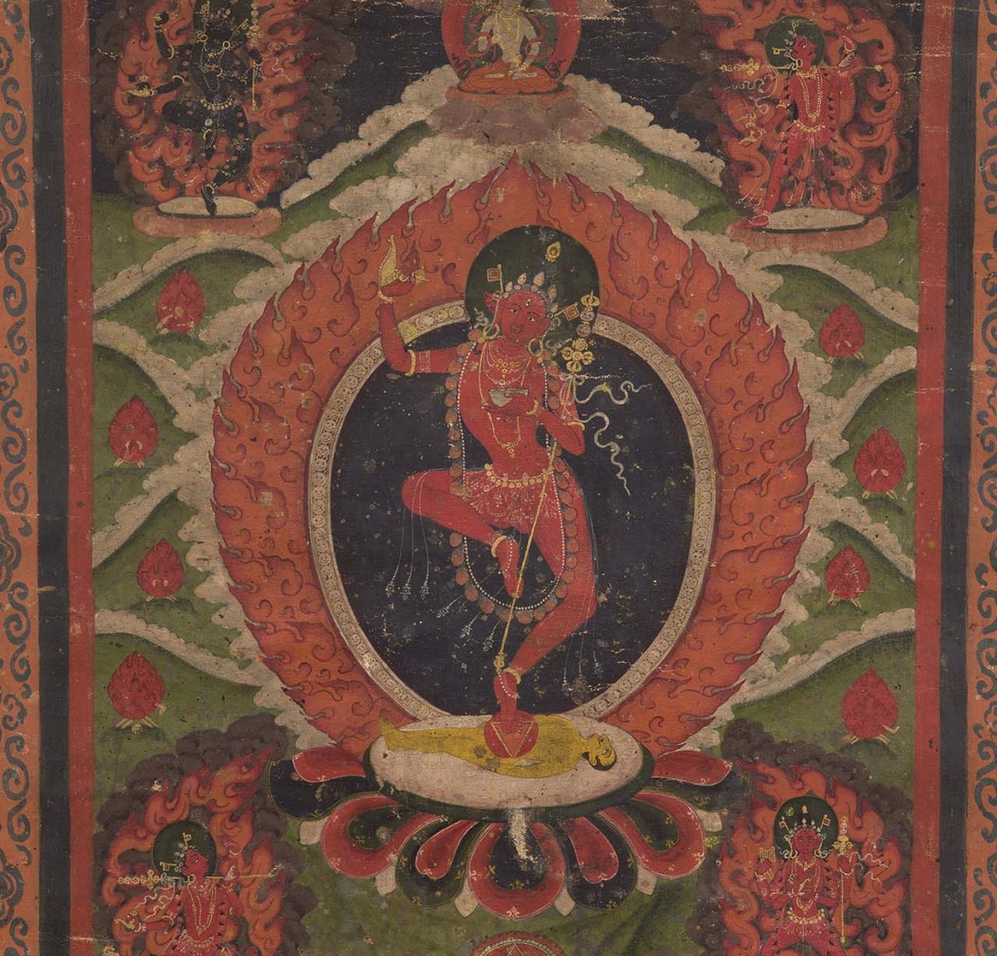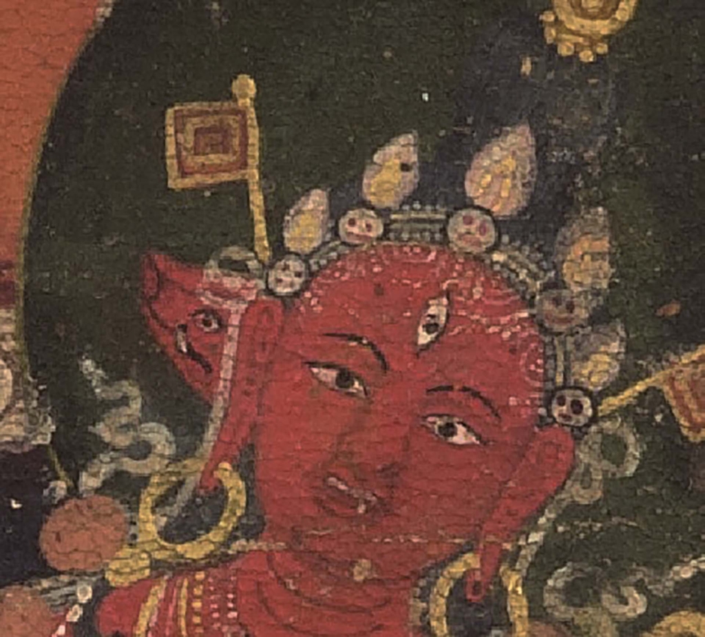 尼泊爾的金剛亥母畫和西藏的綠度母雕塑像一類女性神祇的圖像,彰顯出這些神祇所體現的智慧、力量和保護的圖像和藝術形式。〈金剛亥母〉(圖3)的辨識特徵是臉上的小豬頭(亥母varahi,圖4),她的姿態活潑,姿態類似於跳舞,站立在象徵女性本質(female principle)的紅色三角形之上,手持鉞刀和骷髏杯,並將天杖(khatvanga)揣在左肘,被智慧之火圍繞。畫作中,位於上方的密宗神祇金剛薩埵(Vajrasattva)與位於四角的四位女侍共同構成了這個神聖的聚會,形成了人物式壇城。色彩調性屬於當時內瓦爾(Newar)繪畫的典型,其中盛行的風吹火焰造型據說在15世紀時被納入內瓦爾的繪畫傳統。蓮花座下方是畫作的男女供養人,他們虔誠跪坐在壇城兩側,壇城以重疊的紅色三角形呈現,即「法相之源」(梵文dharmodaya,藏文chojung)。