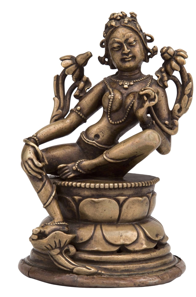 在西藏、喜馬拉雅和蒙古佛教文化中,度母(Tara)可能是最受歡迎的女性神祇。信徒深信她能夠拯救與保護他們免於各種災難與危害。西藏和喜馬拉雅地區對她的崇拜可能源於著名的印度大師阿底峽(Atisha Dipamkara Shrijnana,約982-1054),對他來說,度母是他冥想修習的核心。本次展出的〈綠度母〉這尊優雅的度母雕像(圖5),一腿輕柔地踏下,彷彿正從蓮花座上降臨,準備伸出援手給那些呼喚她的信眾。