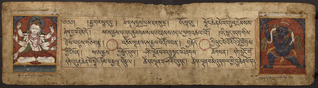 雖然佛教的圖像傳統相對一致,但喜馬拉雅藝術卻展現出豐富多變的視覺風格、地域特色和文化美學。展區「材料與技術」展示了形成這種多樣性的藝術製作方法,包括木刻、石雕,黏土創作和紙上繪畫的歷史示例。如本次展出的《大千摧碎佛母經》即是以棕櫚葉製成、呈長方形橫向格式的印度手抄本(圖7),稱為photi,印度語意為「書」,為藏文長書pecha紙質手抄本的參考模型。早期的藏文紙質手抄本甚至保留了綁定棕櫚葉頁面的繩索孔位的空間,不過在藏文手稿中這些孔位是被兩個紅色圓圈所取代,就如同這個例子所示。小型彩繪圖像經常裝飾著頁邊。由於媒材的轉變和紙張大小的限制,藏文書籍通常比印度棕櫚葉手稿寬,但長度較短。