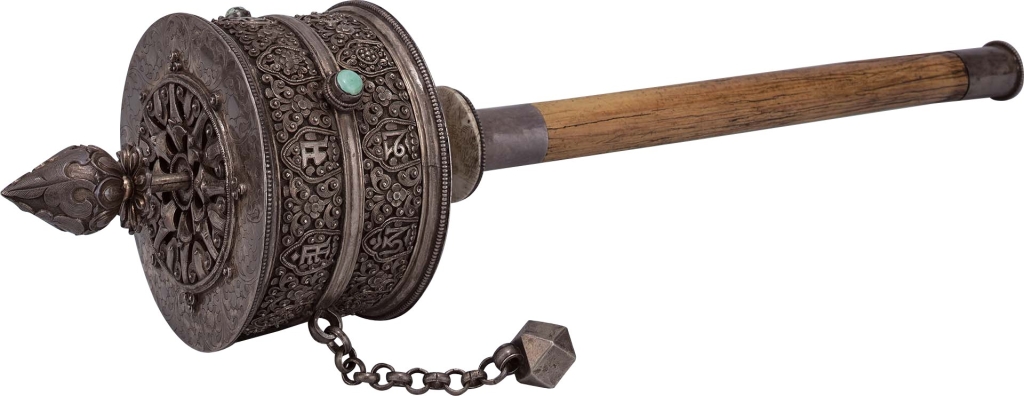 西藏和喜馬拉雅佛教徒委託藝術製作的主要原因,是為了增添功德或積累善業。雖然眼下可能是為求取榮華富貴、長壽無病,或幫助親友康復,但長遠來說委託製作特定神祇的形象可以積累善業並增添功德。在家修行的居士和出家僧侶常藉由日常實踐創造功德,其中有些方式也許看似簡單,如繞著佛塔、寺廟或聖地行走的同時轉動手持的轉經筒(lag khor,圖9),據信可以為轉動經筒的人、周圍的人和環境帶來利益,產生巨大功德。只要秉持正念、轉動轉經輪,並誦經即可產生功德,最常誦念的經文是六字真言(Om Mani Padme Hum),為慈悲的化身─觀世音菩薩(藏語Chenrezik)的咒語。人們相信,轉動經筒可以激活緊緊纏繞在轉經輪筒內的紙上咒語,從而發揮效果。本次展出的〈手持轉經筒〉,即在外部飾有咒語以及各式吉祥寓意象徵(更詳細的轉經輪介紹與使用展示詳見影片)。