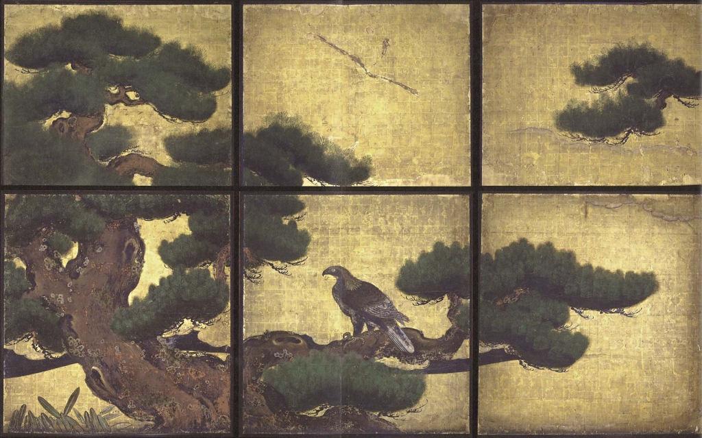 隨著豐臣秀吉過世,德川家崛起,狩野派經過內部紛爭,分出留守在京都的京狩野派及隨著將軍前往江戶(今東京)的江戶狩野。江戶時代的狩野派畫家中,最為人熟知的是狩野探幽(1602-1674),前述的二条城障壁畫,即出於他及其狩野一家畫家之手。去過二条城的人,想來一定會進入二之丸御殿參觀,其實從進門開始的每間房間都存在著狩野派的手筆。狩野探幽接下二条城障壁畫工程,據說以房間的重要性以及畫師的技法,將不同房間分配給不同的族人畫師。探幽自己繪製的,當然就是二之丸御殿中等級最高的大廣間。代表作〈松鷹圖〉(圖2)以金箔為地,其上繪製參天巨松,松幹渾厚粗壯,三隻老鷹分別停棲在不同松幹之上,整體氛圍不怒而威。大廣間為大名晉見將軍之所,繪製巨松及老鷹,意味著一統權勢,震懾的氣氛不言而喻。