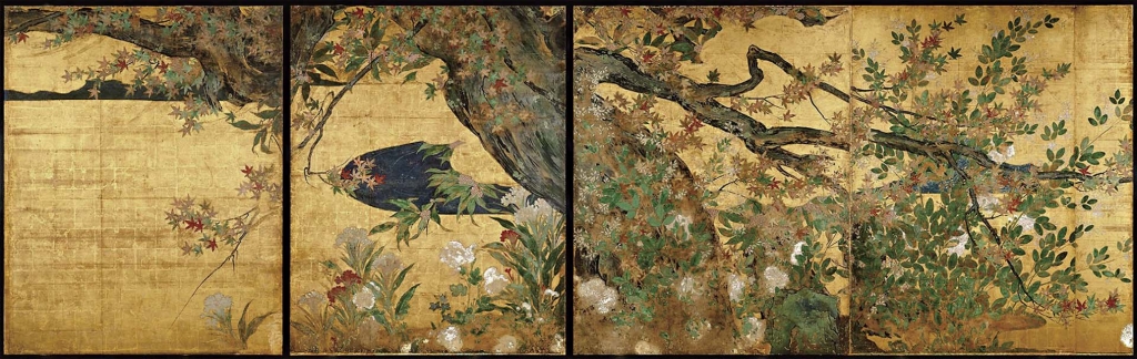 天正十九年(1591),豐臣秀吉愛子鶴松不幸早夭,悲痛萬分之際,秀吉想為兒子修建一間菩提寺供奉(筆者按:菩提寺為供奉先祖、家人遺骨之所),即祥雲寺。按道理來說,祥雲寺障壁畫工程應該也是由狩野派接手,但不巧狩野永德於前一年(1590)過世,狩野派處於內部紛爭,此一工作便落到長谷川等伯手中。祥雲寺障壁畫〈楓圖〉(圖3)、〈櫻圖〉便是等伯及其子久藏的作品。〈楓圖〉、〈櫻圖〉雖然乍看與狩野派風格相似,一樣以金箔鋪底,參天大樹,但包含了許多花草細節,氣氛一下子就柔和了許多,甚至帶著點點哀愁,像是想把豐臣秀吉對早逝兒子的思念雜糅其中。同時,在這批畫作完工前夕,等伯的兒子久藏也驟然離世,當時55歲的等伯,又在多麼傷痛的情況下完成這些作品的呢?承載著兩位父親對亡子念想的一系列祥雲寺障壁畫,部分因大火燒毀,留下來的部分則存放於京都智積院中。