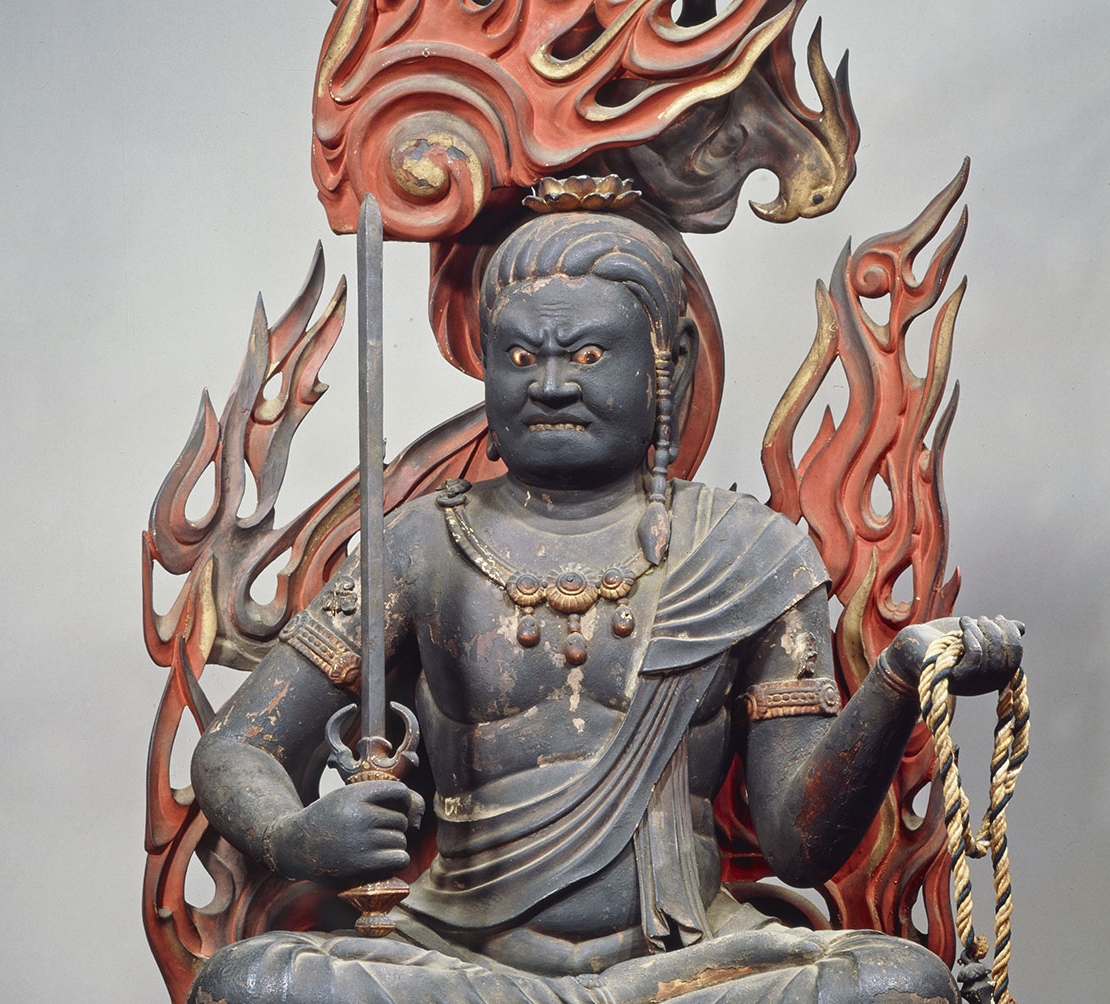 密教中最重要的五大明王,分別為不動明王、降三世明王、軍荼利明王、大威德明王與金剛夜叉明王,以忿怒形象教化不信從佛法的剛強眾生。其中,在五大尊中居中間位置的不動明王,是毘盧遮那佛(大日如來)的忿怒相化身。重要文化財快慶〈不動明王坐像〉(圖4),杏眼圓睜瞪視,上牙緊咬下唇,其特徵為梳著莎髻(以莎草結髻,代表如來侍者的身分),左垂辮髮,象徵悲憫眾生;右手持消除魔障的三鈷劍,左手握縛住邪惡煩惱的羂索,背襯熾熱的火焰。近年研究指出,這尊造像的形象可能來自京都神護寺所藏、平安時代九世紀的〈高雄曼荼羅〉,是為空海從唐代請來的曼荼羅轉寫本。在快慶〈不動明王坐像〉像體內側有多處墨書落款,最引人注目的是胸部的「巧匠安(梵文)阿彌陀佛」,這是鎌倉時代著名佛師快慶的法號。除了快慶落款,還有供養人和數十個名字,推測當中可能有快慶作坊中的匠師,如「御眼巧匠」或許是負責製作玉眼的工匠。
