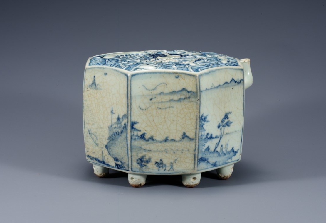 在臺灣以韓國美術為主題的展覽,最具規模者為2024年初結束的故宮南院「朝鮮王朝與清宮藝術交會」特展,展中呈現18世紀朝鮮王朝(1392-1897)與中國的互動交流。其中,來自日本大阪市立東洋陶磁美術館二件18世紀朝鮮〈青花山水紋長方形水滴〉、〈青花鐵繪葡萄山水紋八角形癸卯六月日分院銘水滴〉,紋飾均呈現出「瀟湘八景」中的「洞庭秋月」主題。近期,韓國國立光州博物館「陶瓷.懷抱風流」特展,重點展件中亦有〈青花瀟湘八景紋八角硯滴〉。「瀟湘八景」在青花瓷上的表現,其清新淡雅的色調不僅透露擁有者的個人情趣,亦反映出當時中韓文化交流之現象。