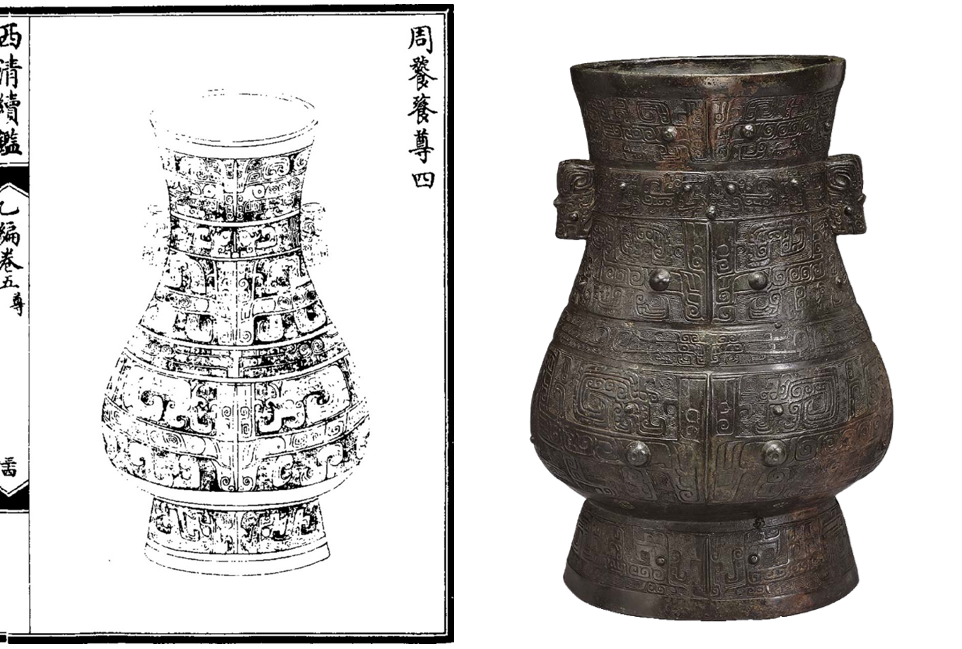 青銅整理及收藏作為「古」的意象,在乾隆朝有一定的發展,《西清古鑑》為重要材料之一。《西清古鑑》全書有40冊卷,為清朝第一部記錄宮廷藏古代青銅器的大型圖錄,共收錄1529件青銅作品。根據書前上諭可知是在乾隆十四年(1749)開始編纂,成於十六年(1751),最後於二十年(1755)刊刻成書。隨後還有一系列續作:《寧壽鑑古》(1781)、《西清續鑑甲編》、《西清續鑑乙編》(1793)(圖5)。