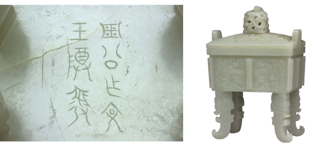 紋飾方面,也同樣有模仿青銅器紋樣玉器國立故宮博物院藏清乾隆〈玉「文王」方鼎〉(圖10),器身上琢刻有饕餮紋,器外底刻有「魯公作文王尊彝」七字銘文。〈玉「文王」方鼎〉青銅器曾被收錄於《宣和博古圖》及《西清古鑑》中,上面的確有此七字銘文。可見除了模仿紋樣,就連青銅器上的銘文刻字也成為追摹的對象。