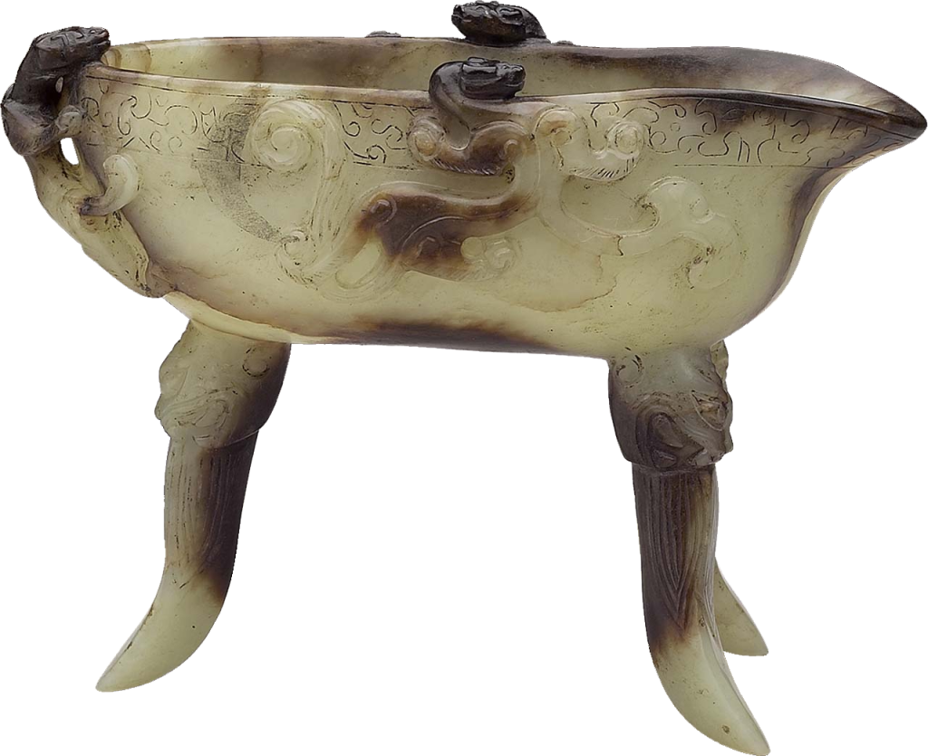 仿古青銅器的玉器,並非創始於清代。回溯過去,南宋墓葬中已見有類似例子,但其實在明代以前並未常見,真正開始有一定數量的製作,可能始於明代中晚期,明神宗定陵出土〈金托玉爵〉便屬一例(圖3)。這件作品模仿古青銅爵,兩側雕刻有蟠龍形把,蟠龍弓身、爪抓口沿,放置在一金托盤中,整體造型可能有「壽山福海」之意。是次展覽也展出兩件明晚期至清早期〈玉蟠螭三足匜〉(圖4),模仿自古銅器之匜(筆者按:這類作品也有人認為是仿古代的青銅爵)。