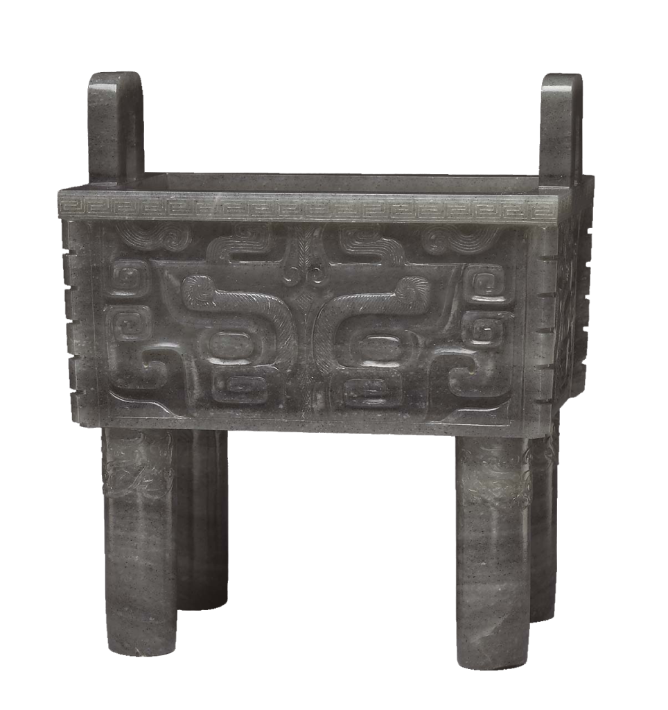 以玉仿古的玉器,紋樣雖有部分簡化,風格卻學習了青銅器鑄造時特有的銳利邊角(圖12),和過往強調溫潤質感相當不同,也是過去玉器較少見之處。而大量的以玉仿古,或代表乾隆帝對於自我功績的陶醉,也或呈現乾隆帝有意對比兩者,認為玉在性質上相類於青銅,同樣具有不易朽壞的特質。在乾隆朝不注重青銅器價值的同時,乾隆帝以玉對比青銅重器外,大量以玉仿古或更代表玉器接續了青銅作為國家重器、傳之後代的大任,似乎有意抬高玉的價值。