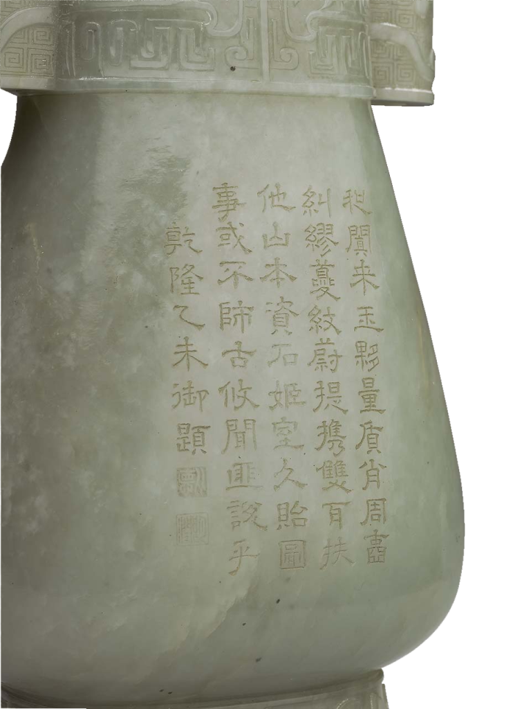 在對青銅的敘述中,乾隆帝時常強調其質堅硬,如《西清古鑑》序文便提到「良以質堅而體厚,不為燥濕所移,剝蝕所損」,而在論玉的御製詩中,乾隆帝對於古玉的讚揚多次提及「入土出土各千年」、「卻歎玉堅猶若此」,強調即便千年埋藏於地底,玉器仍然可以保存,其質之堅令人驚嘆,想來可能是將玉料和青銅一同視為具有堅硬、不易損毀的特質。以這樣質堅的玉料仿古,可使作品流傳千年不易損毀。再加上乾隆帝對於「古」的界定並不僅在於追摹理想三代,而是在「古樸」、「不華囂」風格的追求之餘,更期待其留存永世,和為了政治正統性及「再現三代」的目的並不一樣。乾隆帝雖然同樣追崇歷朝歷代賢能君主,但對他來說更重要的是朝著未來、朝著前方展望,期許自己的聖君形象可永留後世。