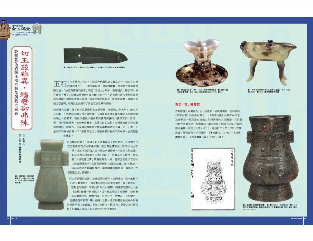 清代的鼎盛時期,乾隆朝距離開國已過百年,政治合法性或不再是需關注的重點,且因政治安和,修復禮制關係也不是那般急迫。總的來說,向上追求三代理想政治不再是最終核心;向下對後代延伸,將當時所作、所為、所藏廣布人知,為本朝在後世的歷史評價鋪路,可能是乾隆朝作《西清古鑑》的另一原因。在此基礎上,乾隆朝對「古」的追求不再是亦步亦趨,也可能沒有過去宋代士大夫及皇室考究仔細。反而是在對「古」的整理時,出現當朝特殊的發展,正是「以玉仿古」的大量出現。