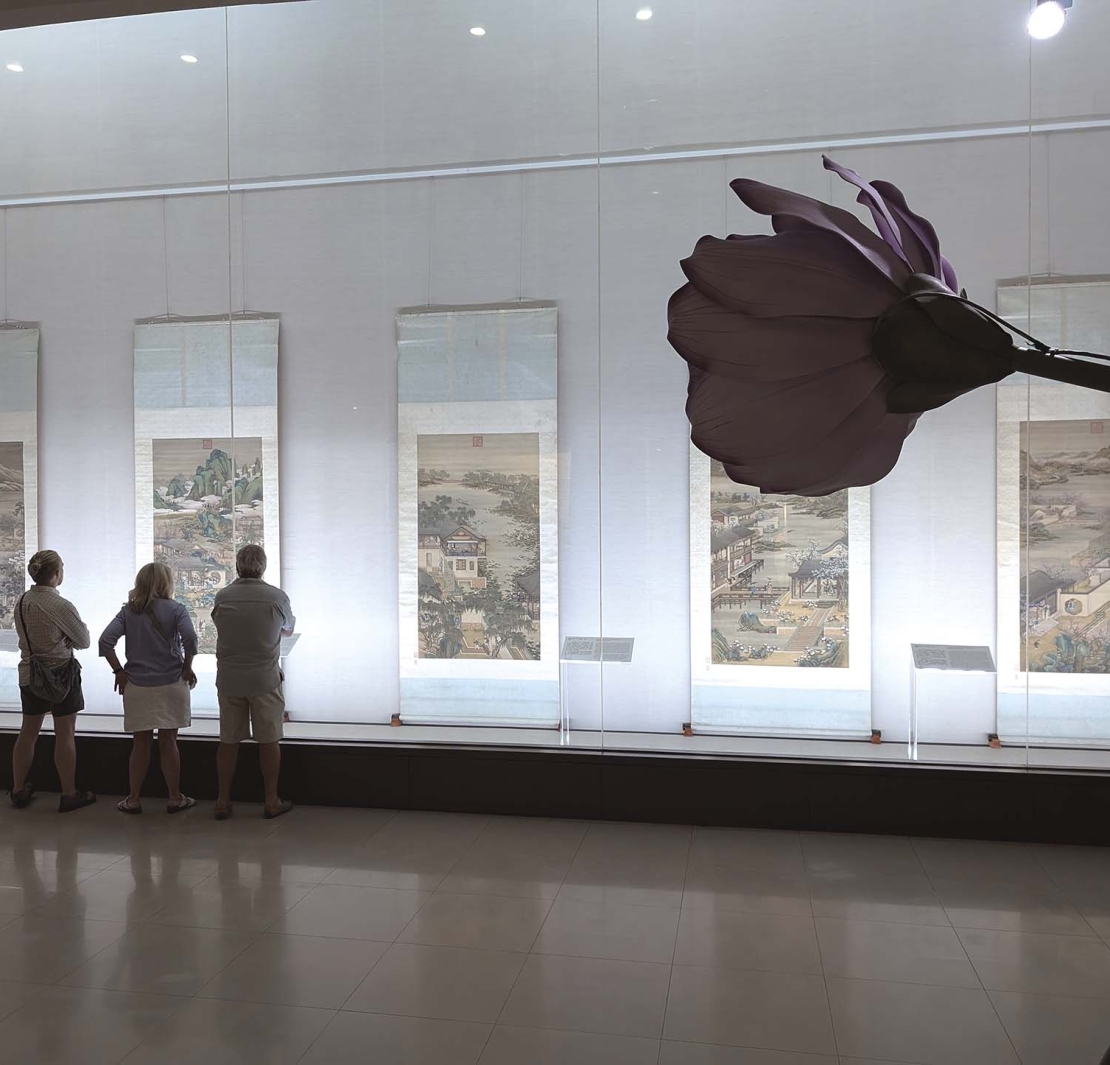 唐詩有云:「人壽期滿百,花開唯一春。」人的壽命或可達百年,而花卉只能綻放一個春天。科學上雖然如此,藝術卻能留下花卉的身影,在千百年後依然呈現花兒嬌美的那一刻。今年暑假,國立故宮博物院「皇帝的移動花園─清代宮廷花卉畫」特展熱烈登場,打破季節與地域的限制,呈現清代宮廷花卉的多樣性與文化。展覽設計致敬了《霍爾的移動城堡》──霍爾的城堡中有一扇任意門,隨著指針指向轉盤不同顏色,可通往花海、山野或市鎮。「皇帝的移動花園」借用任意門的概念,帶領觀眾神遊清代宮廷花園。