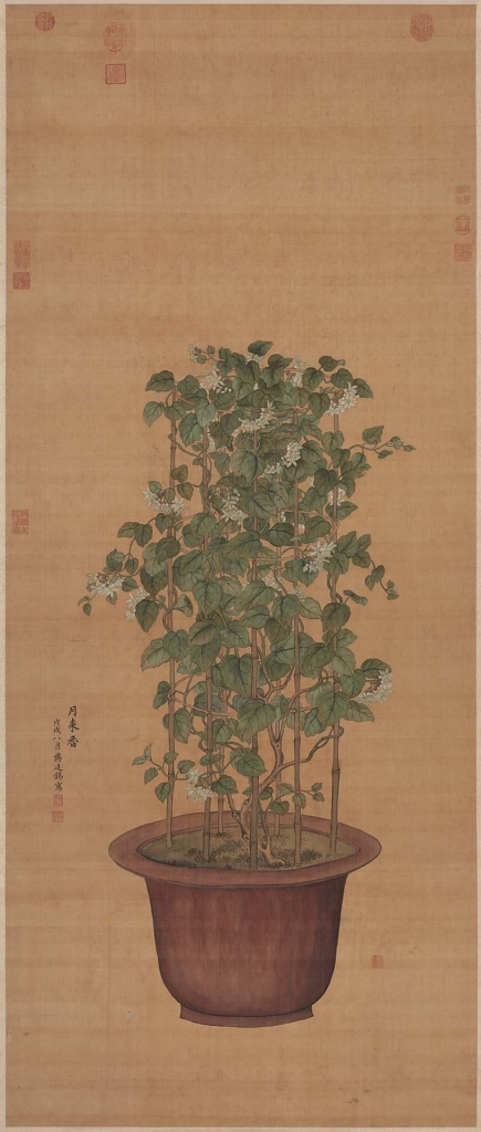 辨認成功的例子,如蔣廷錫〈月來香〉(圖9),此圖品名來自畫家自題,呈現清宮以竹枝供藤蔓攀附的植栽法。過去故宮認為所繪植物是天門冬科的「晚香玉」(Polianthes tuberosa L.),但臺大植物標本館研究專員指出,根據植物特徵,應該是夾竹桃科的「夜來香」(Telosma cordata (Burm. f.) Merr.),主要生長在溫暖的南方閩廣一帶(今福建、廣東),清代《植物名實圖考》有北方移種夜來香的紀錄。儘管有植物學家助陣,辨識植物仍面臨難解之題──如「月來香」這類詩詞中的文學名詞,不見得可對應現代學名;此外,植物的花蕊、枝葉細節是判斷物種的重要依據,但繪畫作品往往經過畫家的藝術詮釋,和實際植物有落差,讓專家也難以下定論。