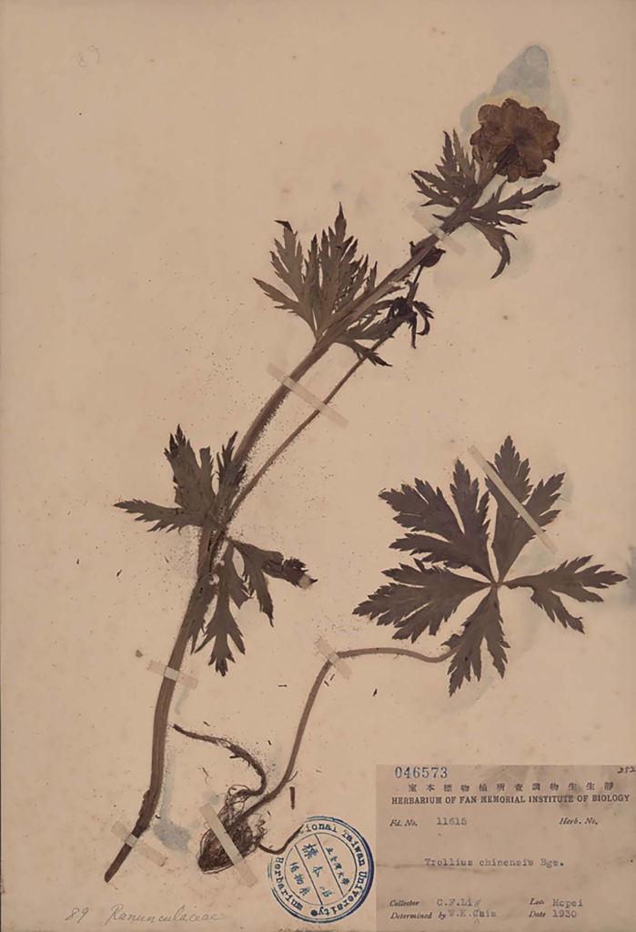 為了讓觀眾更直觀比對花卉畫與實際植物,本次故宮也向林業試驗所植物標本館、臺大植物標本館商借標本,以輸出方式展出(標本原件塗有防蟲毒素,不宜與書畫同櫃展出)。蘇雅芬說,在詢問是否有「金蓮花」標本後,臺大植物標本館在庫房找出毛茛科金蓮花(Trollius chinensis Bunge)標本,且是1930年由北京「靜生生物調查所」在河北省所採集(圖10)。靜生生物物調查所成立於1928年,是近代中國較早成立且有成果的生物學研究機構,為現今中國科學院動物研究所及植物研究所之前身。臺大植物標本館館藏有部分承襲自日治帝國大學時期,以東南亞植物標本為主,在館內發現這份來自塞外的標本也令館員感到意外,或許是經由標本館之間交換而來。「皇帝的移動花園」展覽以畫追尋花卉脈絡,而植物標本竟也自帶歷史脈絡,留有近代生物學發展軌跡,彷彿清代宮廷花卉畫的番外續篇,更為展覽添一層況味。