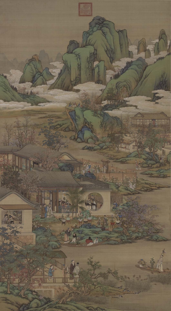 作為故宮暑期強檔,展覽自然不乏國寶坐鎮。本次最重量級的國寶當屬清畫院〈畫十二月月令圖〉(圖1),全套十二幅中有五幅現身故宮大畫區,它們大致可呈現清宮一年四季的花卉活動:二月杏花盛開,花瓣簇成粉紅世界,文人雅士在爛漫春光中讀書賦詩,或在慶祝二月十五日的「花朝節」,據說此日是百花的生日。四月到,宮苑地植的牡丹盛放,樹梢則有白色玉蘭相襯。較為特別的是,傳統認為牡丹的花期在三月,紫禁城或許氣候較冷,故延至四月才開。六月盛夏,趁陽光炙熱,童僕將書搬出曝曬,驅走梅雨季的濕氣;仕女乘著小舟,至荷塘中摘採蓮花,插成瓶花。九月重陽節來臨,各色菊花爭色,喬木也一同變色,為賞菊、登高提供繽紛美景。最後,十二月的白雪輕輕覆蓋了宮殿與花園,唯梅花在凜冬盛放,成為插瓶的主角。蘇雅芬提示,自古雖然男女有別,不宜處在同個空間,從這套作品可以感受到,賞玩花卉是無論性別都能享受的療癒活動。