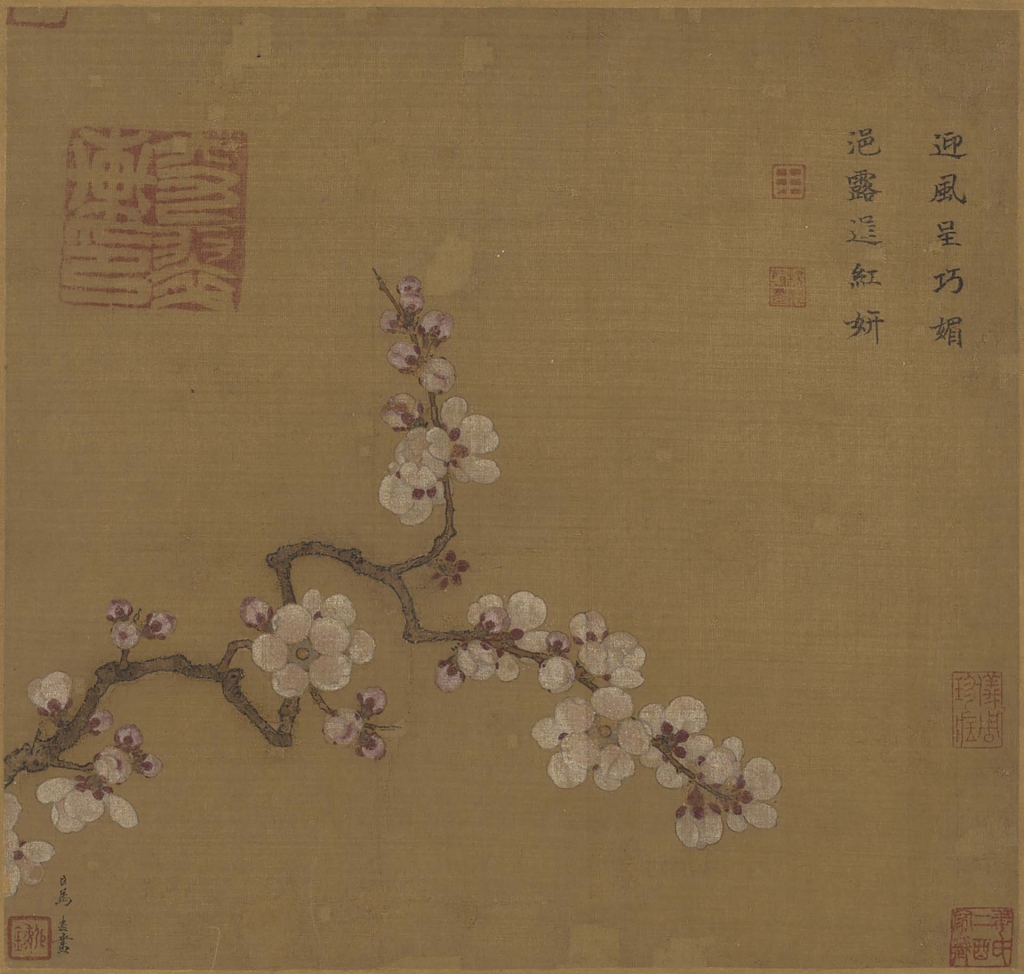 馬遠〈倚雲仙杏〉(圖2)則傾向折枝花形式,省略背景與全株植物,僅表現局部。詰屈的枝條從邊角伸出,符合南宋宮廷畫家馬遠「馬一角」的特徵;枝條上的花朵,涵蓋含苞、盛放、凋零的不同階段,亦符合南宋花卉畫時間感的表達。右上的小楷書出自南宋寧宗的楊皇后(1162-1233),楊皇后是中國歷史中少數以藝術留名的皇后,在馬遠、夏珪、馬麟等南宋宮廷畫家的作品上,經常可見她的題字。這幅畫是展覽中的一個彩蛋,若說皇帝是霍爾,那楊皇后就是他鍾愛的蘇菲,在花園悄悄留下字蹟。