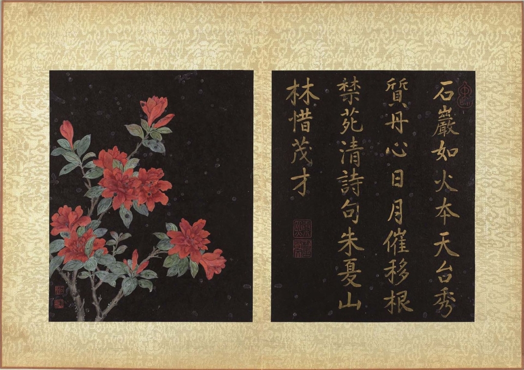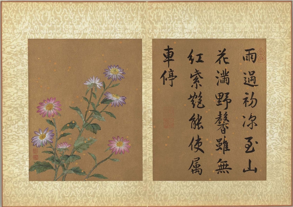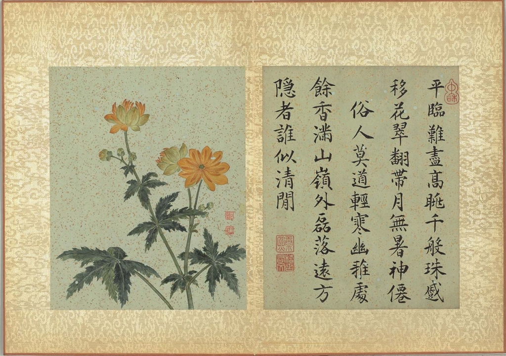 蘇雅芬指出,《畫群芳擷秀》(圖3)最能代表康熙朝特色,此冊12開,取材12種花卉,採繽紛的色箋為底,由宮廷畫家蔣廷錫作畫,康熙皇帝親題詩詞。「在這裡可以很明顯看到塞外植物進入宮廷繪畫主題,第四開是塞外的野菊,第七開是金蓮花,而且康熙特地為它們新作詩詞,其他開的詩詞多抄自前朝詠物詩。」據文獻記載,康熙喜歡在色箋題詩賜給群臣,展現滿人皇帝的作詩能力,不過現存作品少,《畫群芳擷秀》是少見康熙題於色箋的例證,且詩文、圖像、印章有意配成一套,更顯難得。
