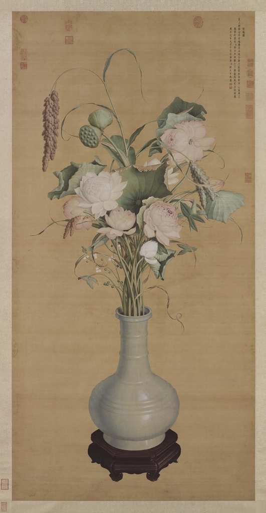 與康熙皇帝相較,雍正皇帝對植物的興趣沒那麼強烈,其脈絡大致承襲康熙朝。雍正在位期間的「花鳥畫」明顯多於「花卉畫」,且多重視吉祥寓意,而非自然科學性的觀察。本次展覽僅有一件屬雍正朝製作,即郎世寧〈聚瑞圖〉(圖4),畫家以中西合璧的筆法繪雙頭稻穗、重臺蓮與並蒂蓮,錯落地插在青瓷弦紋瓶中。題跋記曰:「皇上御極元年,符瑞疊呈。分岐合穎之穀,實於原野;同心並蒂之蓮,開於禁池。臣郎世寧拜觀之下,謹彙寫瓶花,以記祥應。」可知這些異變的植物被當作雍正即位的祥瑞之兆,正是雍正朝的特色。