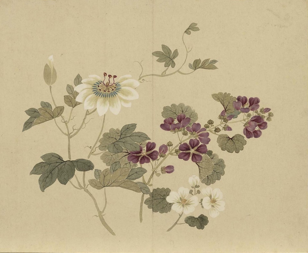 至於乾隆對花卉則抱持一貫的「考據魂」,他不像祖父康熙一樣實地考察,但熱衷於考訂植物類型、典故。第三單元「花譜考據:皇帝的讀書心得」就是乾隆皇帝的主場,一方面可見他承襲《廣群芳譜》的基礎,一方面又對特定品種展現考究興趣。例如古代有「西番蓮」一詞,泛稱從外地引進的花卉,在各地的方志和類書中記載不同,而乾隆皇帝很想找出實際指涉的品種,他在〈西番蓮賦〉中提到,《廣群芳譜》對西番蓮的記述不盡正確,他認為西番連應該是「細蘂紛敷,中碧外藍。近心紫簇,心湧青拳。橫吐五鬚,結如意團」。按照乾隆的描述,西番蓮的樣貌可能如董誥《四景花卉冊》所繪(圖5),與百香果花有親屬關係。