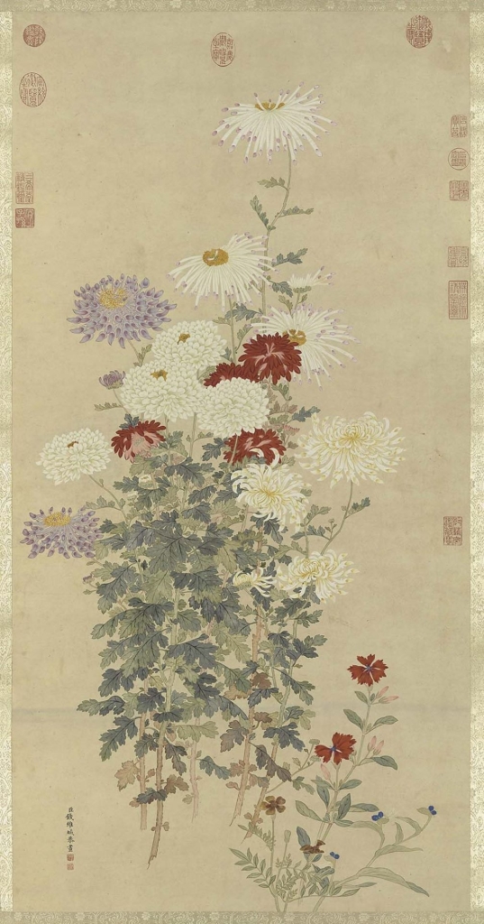 乾隆期間,宮中可見多種造型特殊的「洋菊」,有些尺寸碩大,異於中國本土所產,乾隆皇帝形容:「洋菊花近年始出,各種不一。其大有徑周尺者,不見於古。」雖稱為洋菊,乾隆對它們是否來自歐洲卻抱有懷疑,在詩中提到:「本是東籬種,誰教冒海西」,懷疑這些洋菊原產中國,只是冒稱為歐洲所進,乾隆詞臣鄒一桂在《洋菊譜》也認為洋菊應是「人力所接,冒以洋名,實出中國」。事實上,歐洲在19世紀中葉才培養出較多新品種菊花,乾隆朝所見的菊花的確不太可能來自歐洲。根據乾隆朝宮廷畫家創作的洋菊圖像,學者發現許多品種可以在日本江戶時代的菊花培育書中發現,如錢維城〈畫洋菊〉(圖6)中淺紫色的菊花,具有水滴狀開口、管狀的特殊花瓣,在江戶時代(1717)出版的《花壇菊花大全》便記有這種花型。江戶時代是日本培育菊花的黃金時代,而日本的菊花原引自中國,所以乾隆朝所見的「洋菊」確實有可能原生於中國,經過日本育種後再度傳入中國,由此不得不佩服乾隆皇帝對植物品種的敏銳度。